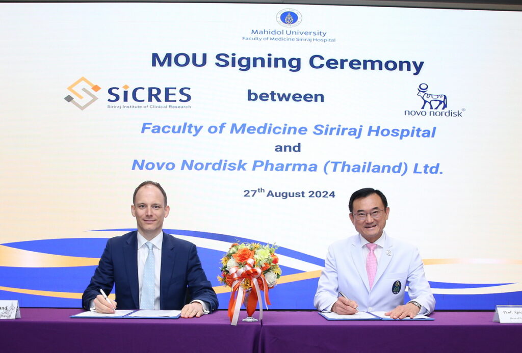 บริษัท โนโว นอร์ดิสค์ ฟาร์มา (ประเทศไทย) จำกัด ซึ่งมีสํานักงานใหญ่อยู่ที่เมืองโคเปนเฮเกน ประเทศเดนมาร์ก ได้ลงนามบันทึกข้อตกลงความร่วมมือ (MOU) กับ คณะแพทยศาสตร์ศิริราชพยาบาล มหาวิทยาลัยมหิดล โดยมีวัตถุประสงค์เพื่อส่งเสริมความร่วมมือในการศึกษาวิจัยยารักษาโรคเบาหวานและโรคเรื้อรังร้ายแรงอื่น ๆ เช่น โรคอ้วนและโรคเกี่ยวกับเลือดและต่อมไร้ท่อที่พบได้ยาก นอกจากนี้ ยังเป็นการเปิดโอกาสให้ผู้ป่วยมีส่วนร่วมในการวิจัยทางคลินิก และส่งเสริมผู้วิจัยให้มีทางเลือกในการวิจัยทางคลินิกเพิ่มมากขึ้น ตลอดจนการมีส่วนร่วมในการฝึกอบรม การทำงานร่วมกันของโครงการวิจัย โดยมีจุดมุ่งหมายเพื่อส่งเสริมและกระตุ้นการแลกเปลี่ยนข้อมูลและความรู้เชิงนวัตกรรมผ่านความร่วมมือนี้
