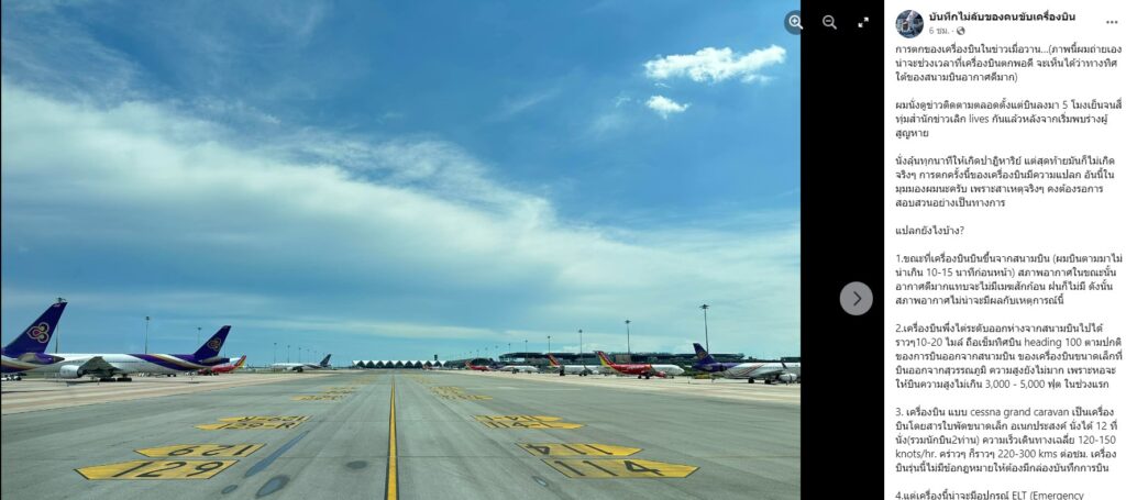 วันที่ 23 ส.ค. 67 เพจเฟซบุ๊ก บันทึกไม่ลับของคนขับเครื่องบิน ได้โพสต์ถึงเหตุการณ์ เครื่องบินเล็ก ของบริษัท ไทย ฟลายอิ้ง เซอร์วิส จำกัด เที่ยวบินที่ TFT209 แบบเครื่อง Cessna caravan C208 ทะเบียน HSSKR ประสบอุบัติเหตุตกแถวพื้นที่หมู่ที่ 6 ต.เขาดิน อ.บางปะกง จ.ฉะเชิงเทรา โดยมีจำนวน ผู้โดยสาร 7 คน และนักบิน 2 คน เมื่อวันที่ 22 ส.ค. 67