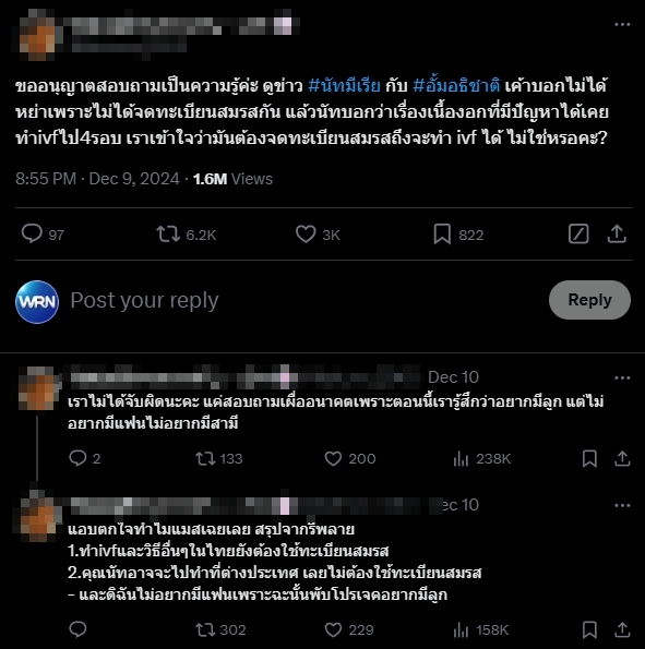 ซึ่งประเด็นดังกล่าว กลายเป็นที่ถกเถียงอย่างหนักในโลกออนไลน์ โดยมีชาวเน็ต รายหนึ่ง ออกมาตั้งคำถามผ่าน X ว่า “ขออนุญาตสอบถามเป็นความรู้ค่ะ ดูข่าว #นัทมีเรีย กับ #อั้มอธิชาติ เค้าบอกไม่ได้หย่าเพราะไม่ได้จดทะเบียนสมรสกัน แล้วนัทบอกว่าเรื่องเนื้องอกที่มีปัญหาได้เคยทำ ivf ไป 4 รอบ เราเข้าใจว่ามันต้องจดทะเบียนสมรสถึงจะทำ ivf ได้ ไม่ใช่หรอคะ?”