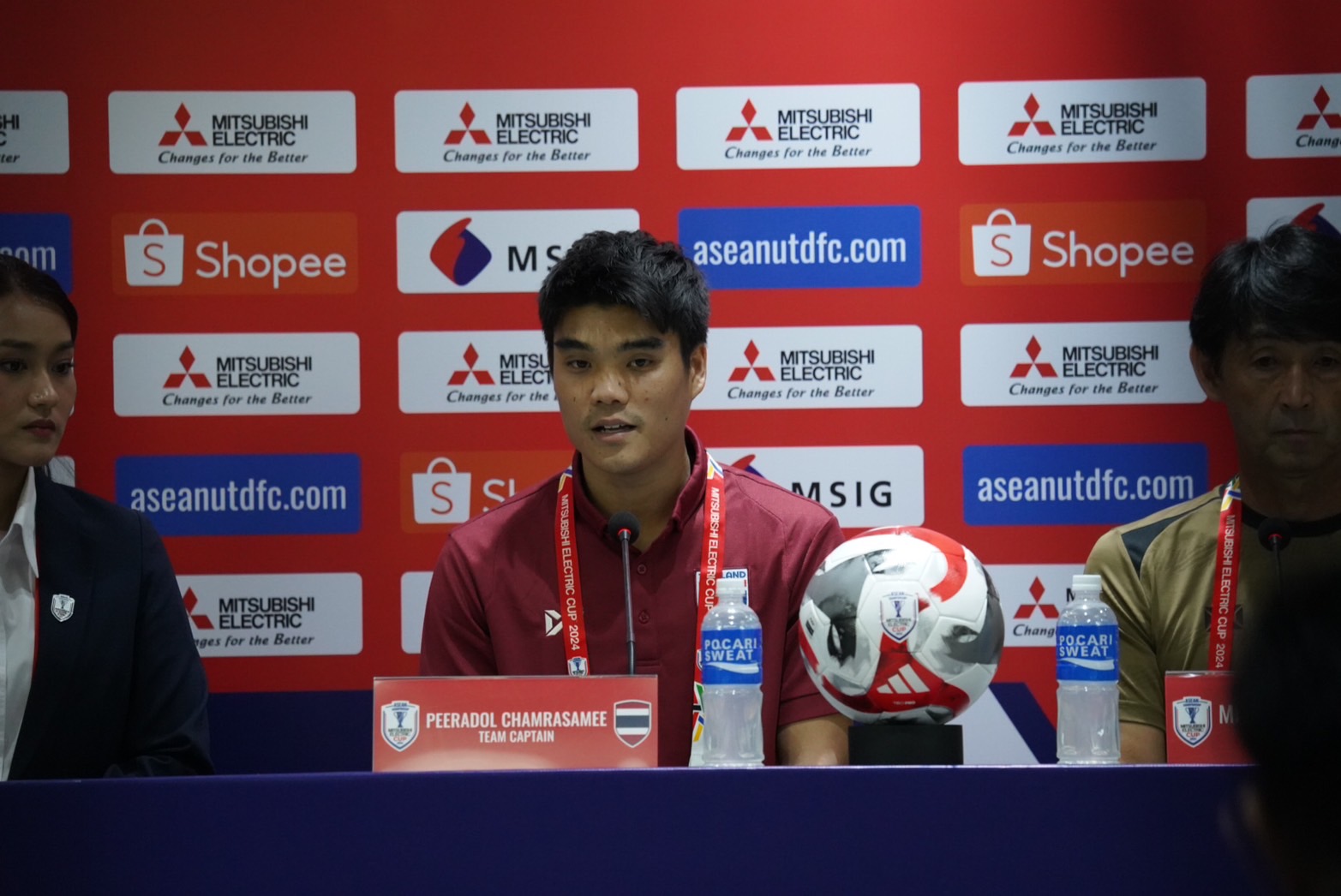 พีรดนย์ ฉ่ำรัศมี มิดฟิลด์กัปตันทีมชาติไทยให้สัมภาษณ์ที่ห้องแถลงข่าวภายในสนาม ราชมังคลากีฬาสถาน ก่อนการแข่งขันฟุตบอล มิตซูบิชิ อิเล็คทริค คัพ 2024 รอบแบ่งกลุ่ม กลุ่ม เอ นัดสอง ที่จะพบกับ ทีมชาติมาเลเซีย ในวันอาทิตย์นี้ เวลา 20.00 น. ว่า ตนเอง และเพื่อนร่วมทีม “ช้างศึก” จะทุ่มเทเต็มที่เพื่อคว้าแชมป์รายการนี้มาครองให้ได้