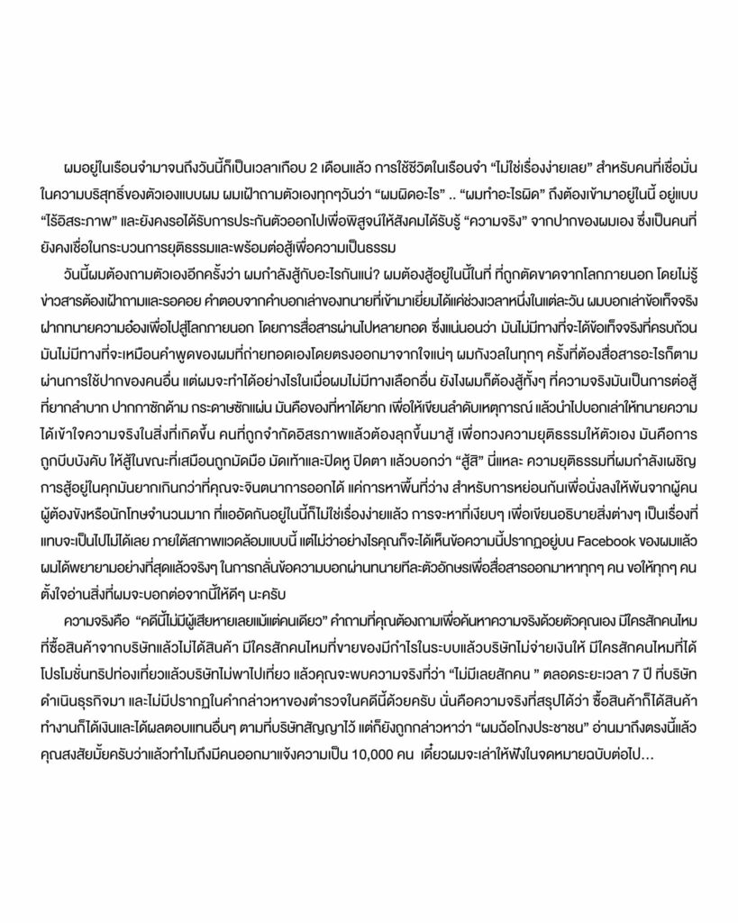การสู้อยู่ในคุกมันยากเกินกว่าที่คุณจะจินตนาการออกได้ แค่การหาพื้นที่ว่าง สำหรับการหย่อนก้นเพื่อนั่งลงให้พ้นจากผู้คน ผู้ต้องขังหรือนักโทษจำนวนมาก ที่แออัดกันอยู่ในนี้ก็ไม่ใช่เรื่องง่ายแล้ว การจะหาที่เงียบ ๆ เพื่อเขียนอธิบายสิ่งต่าง ๆ เป็นเรื่องที่แทบจะเป็นไปไม่ได้เลย ภายใต้สภาพแวดล้อมแบบนี้ แต่ไม่ว่าอย่างไร คุณก็จะได้เห็นข้อความนี้ปรากฏอยู่บน Facebook ของผมแล้ว ผมได้พยายามอย่างที่สุดแล้วจริง ๆ ในการกลั่นข้อความบอกผ่านทนายทีละตัวอักษรเพื่อสื่อสารออกมาหาทุก ๆ คน ขอให้ทุก ๆ คน ตั้งใจอ่านสิ่งที่ผมจะบอกต่อจากนี้ให้ดี ๆ นะครับ