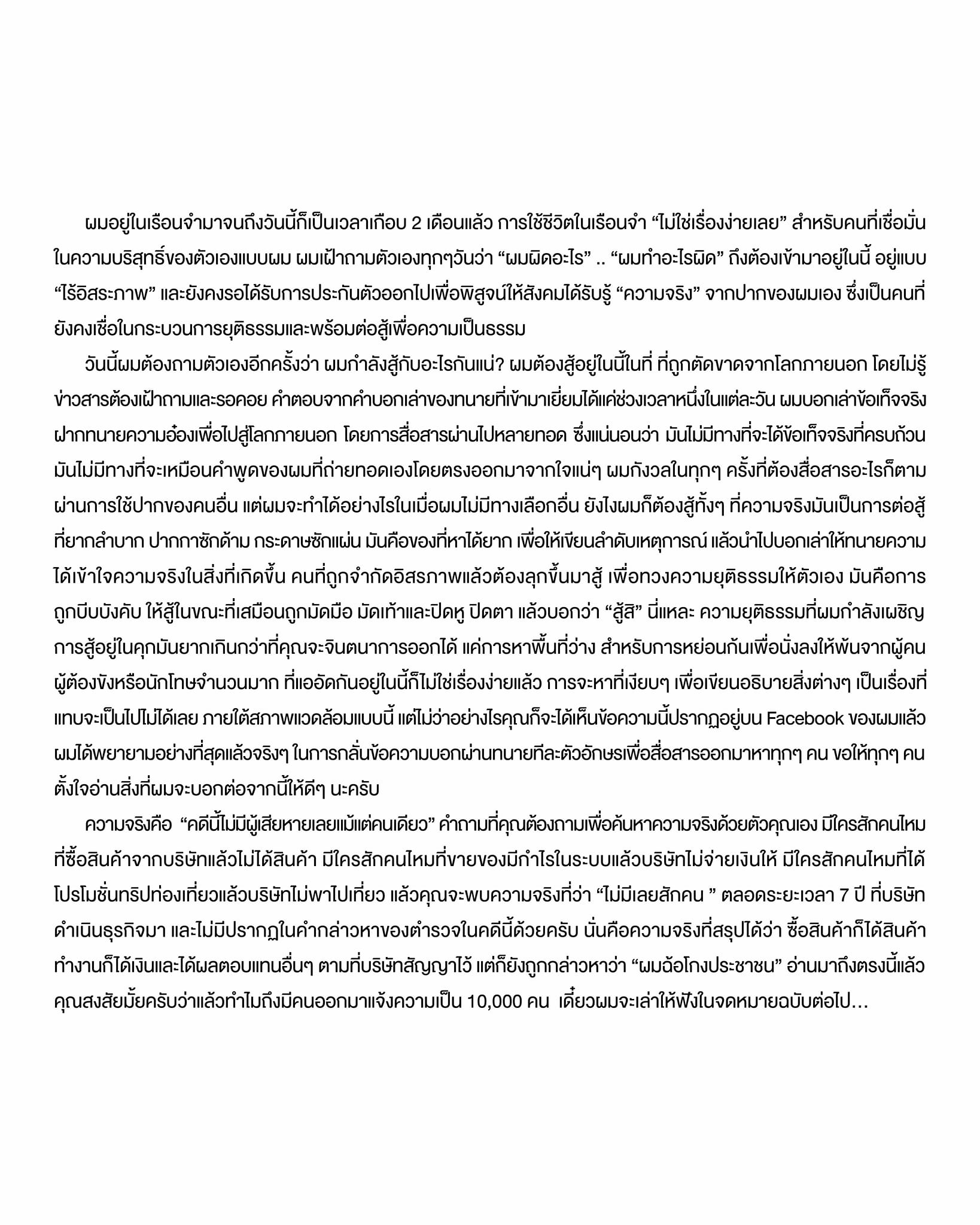 ตลอดระยะเวลา 7 ปี ที่บริษัทดำเนินธุรกิจมา และไม่มีปรากฏในคำกล่าวหาของตำรวจในคดีนี้ด้วยครับ นั่นคือความจริงที่สรุปได้ว่า ซื้อสินค้าก็ได้สินค้า ทำงานก็ได้เงินและได้ผลตอบแทนอื่น ๆ ตามที่บริษัทสัญญาไว้ แต่ก็ยังถูกกล่าวหาว่า “ผมฉ้อโกงประชาชน” อ่านมาถึงตรงนี้แล้ว คุณสงสัยมั้ยครับว่าแล้วทำไมถึงมีคนออกมาแจ้งความเป็น 10,000 คน เดี๋ยวผมจะเล่าให้ฟังในจดหมายฉบับต่อไป”