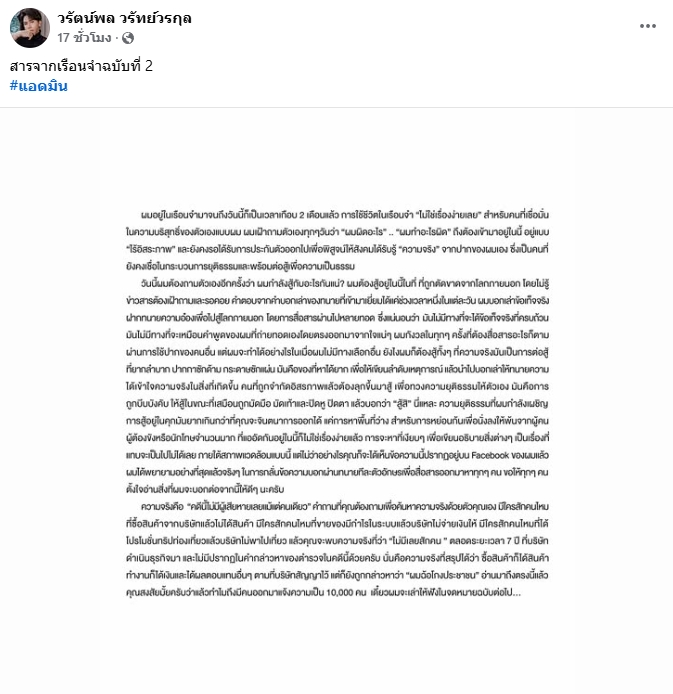 วันที่ 11 ธันวาคม 2567 เพจเฟซบุ๊กของนายวรัตน์พล วรัทย์วรกุล หรือ บอสพอล ซีอีโอและผู้ก่อตั้ง ดิไอคอน กรุ๊ป ได้โพสต์ภาพจดหมาย โดยระบุว่า “สารจากเรือนจำฉบับที่ 2 #แอดมิน” โดยรายละเอียดในจดหมาย มีข้อความดังนี้