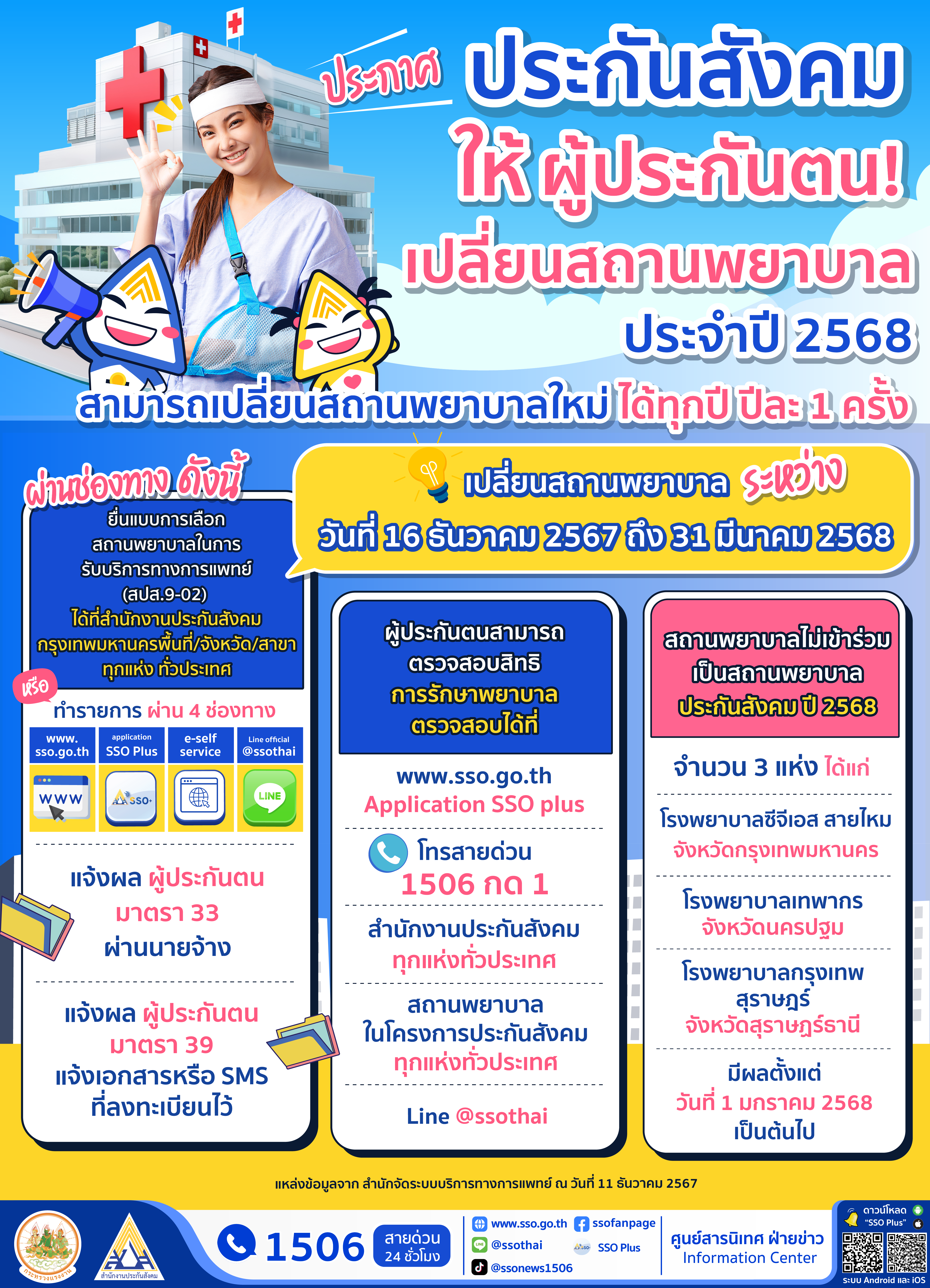 นางมารศรี ใจรังษี เลขาธิการสำนักงานประกันสังคม กระทรวงแรงงาน แจ้งว่า สำนักงานประกันสังคม แจ้งให้ผู้ประกันตนมาตรา 33 และมาตรา 39 สามารถเปลี่ยนสถานพยาบาลประจำปี 2568 ได้ ตั้งแต่วันที่ 16 ธันวาคม 2567 ถึงวันที่ 31 มีนาคม 2568 ผ่าน 4 ช่องทาง คือ 1. ยื่นแบบการเลือกสถานพยาบาลในการรับบริการทางการแพทย์ (สปส. 9-02) ที่สำนักงานประกันสังคมทุกแห่งทั่วประเทศ 2.ทำรายการผ่านเว็บไซต์สำนักงานประกันสังคม (www.sso.go.th) 3. ทำรายการผ่าน Application “SSO Plus” และ 4.ทำรายการผ่าน Line official account (Line OA) โดยเพิ่มเพื่อน Line @ssothai และเพื่อความสะดวก แนะนำยื่นเปลี่ยนสถานพยาบาลผ่านทางเว็บไซต์ของสำนักงานประกันสังคม www.sso.go.th หรือ Application“SSO Plus” เพื่อไม่ต้องเสียเวลาในการเดินทางไปยื่นเอกสาร