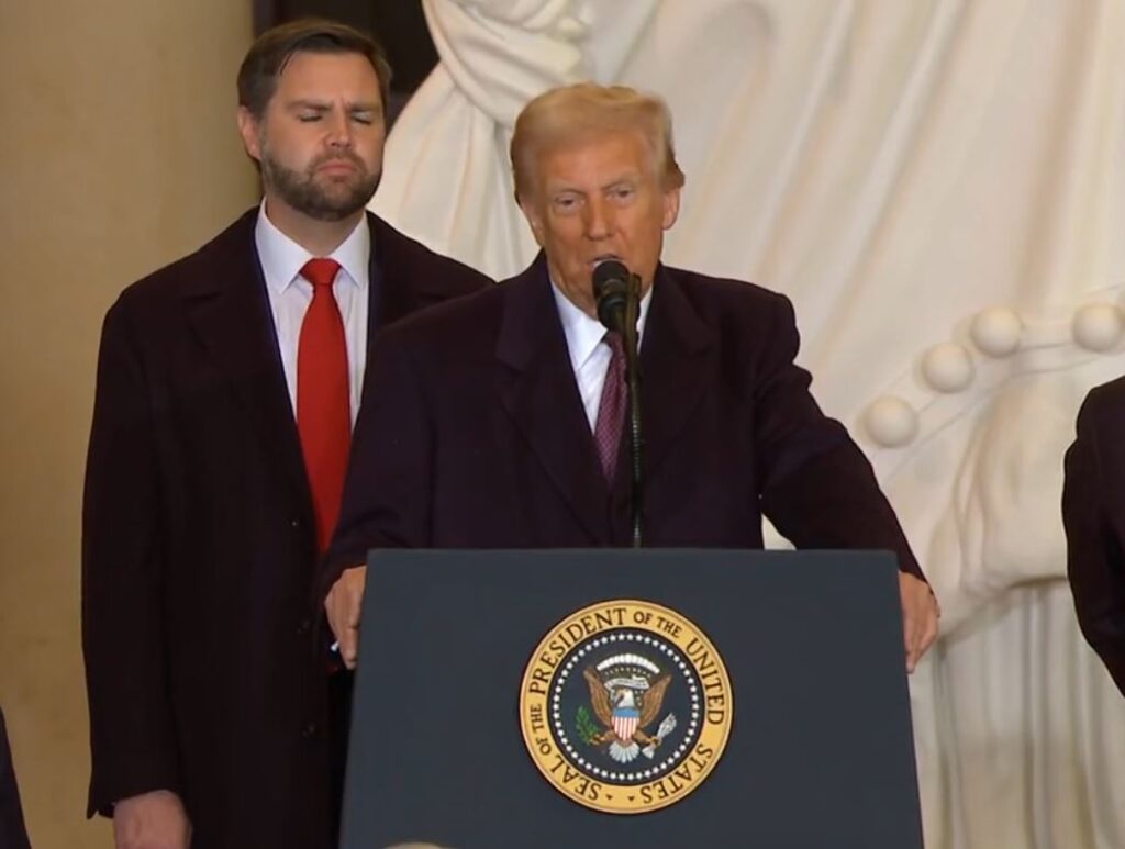 ในระหว่างการกล่าวปราศรัยต่อกลุ่มผู้สนับสนุนและบุคคลสำคัญที่เข้าร่วมพิธีสาบานตน รวมถึงโจ ไบเดน อดีตประธานาธิบดีที่นั่งฟังคำพูดของเขาด้วยสีหน้านิ่งเฉย โดนัลด์ ทรัมป์ได้เปิดเผยแผนการร่างคำสั่งหลายฉบับที่จะลงนามในวันเดียวกันนั้น