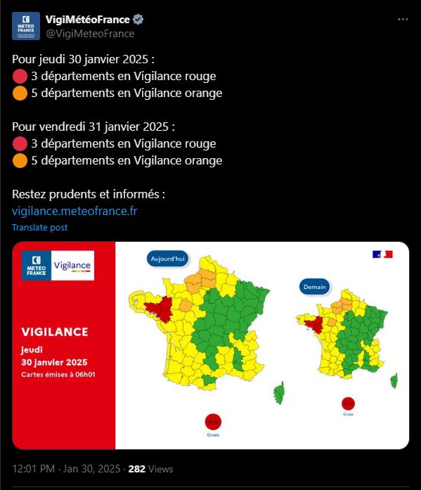 ในวันพฤหัสบดีที่ 30 มกราคม 2025 นี้ มีการประกาศเตือนภัยระดับแดงในสามจังหวัดจากความเสี่ยงที่สูงจากน้ำท่วม ขณะที่อีกหกจังหวัดในภาคตะวันตกเฉียงเหนือและภาคเหนือของฝรั่งเศสอยู่ภายใต้การเตือนภัยระดับส้ม