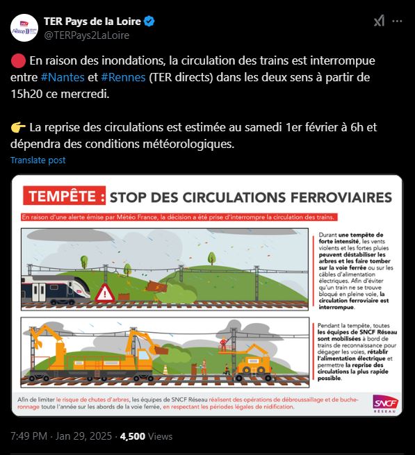 การจราจรทางรถไฟในพื้นที่ยังคงได้รับผลกระทบอย่างหนัก โดยการเดินรถไฟระหว่างเมืองนองต์ (Nantes) และแรนส์ (Rennes) ถูกระงับ “การกลับมาของการเดินรถคาดว่าจะเป็นวันเสาร์ที่ 1 กุมภาพันธ์ เวลา 06:00 น. ขึ้นอยู่กับสภาพอากาศ” ตามการรายงานจาก TER Pays de la Loire บริเวณลัวร์-อาตลานติก (Loire-Atlantique), มอร์บิฮาน (Morbihan) และอิล-เอ-วิแลง (Ille-et-Vilaine) ยังคงอยู่ภายใต้การเตือนภัยระดับแดง ขณะที่จังหวัดคัลวาโดส (Calvados), เมน-เอ็ท-ลัวร์ (Maine-et-Loire), มายาน (Mayenne), ซาร์ต (Sarthe) และออร์น (Orne) ที่อยู่ภายใต้การเตือนภัยระดับส้มสำหรับน้ำท่วม