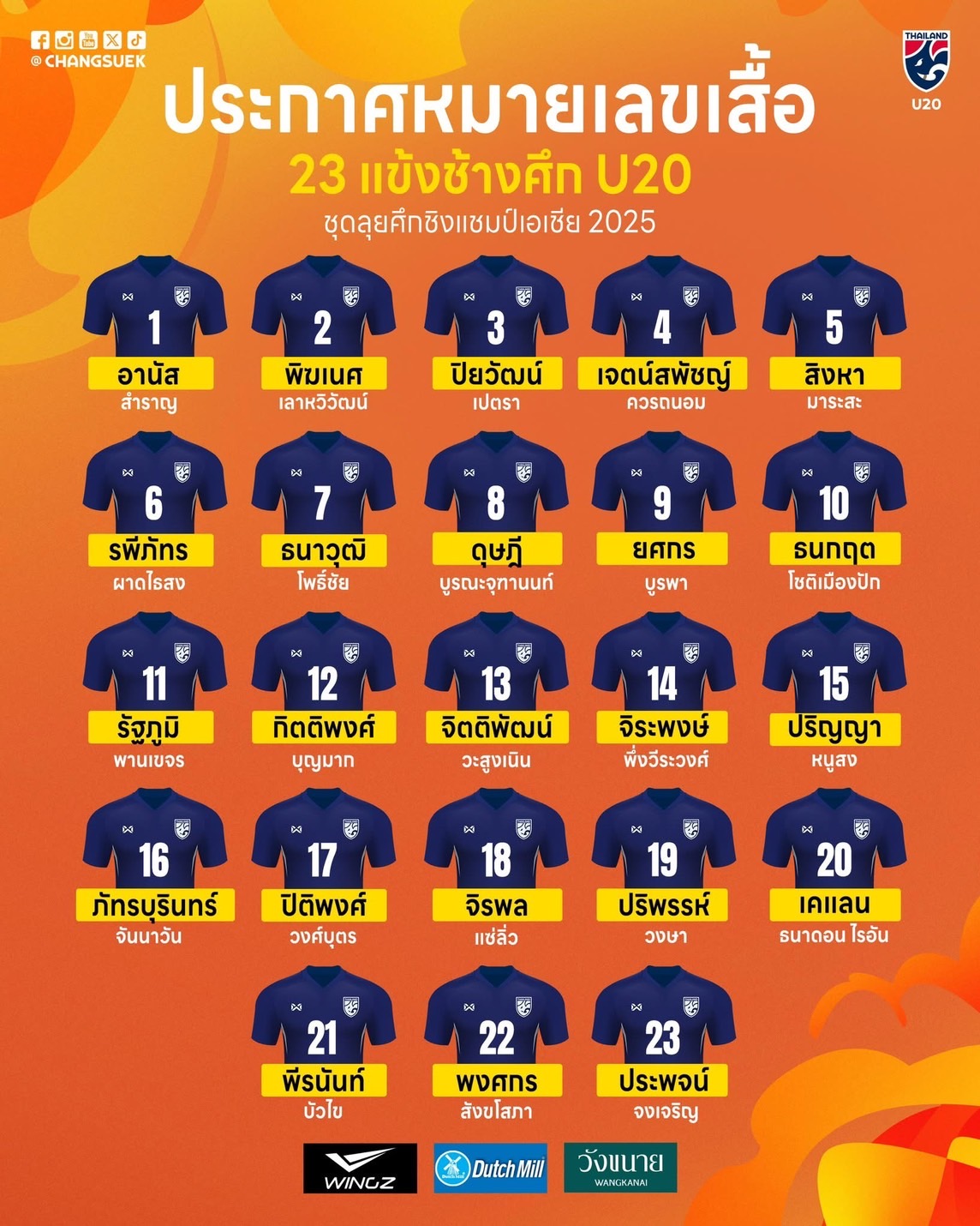 ฟุตบอลทีมชาติไทยรุ่นอายุไม่เกิน 20 ปี ทำการประกาศหมายเลขเสื้อ 23 ผู้เล่นจะใช้ในการแข่งขัน ฟุตบอลชิงแชมป์เอเชีย รุ่นอายุไม่เกิน 20 ปี 2025 ระหว่างวันที่ 12 กุมภาพันธ์ – 1 มีนาคม 2568 ณ สาธารณรัฐประชาชนจีน ออกมาเป็นที่เรียบร้อยแล้ว มีดังนี้
