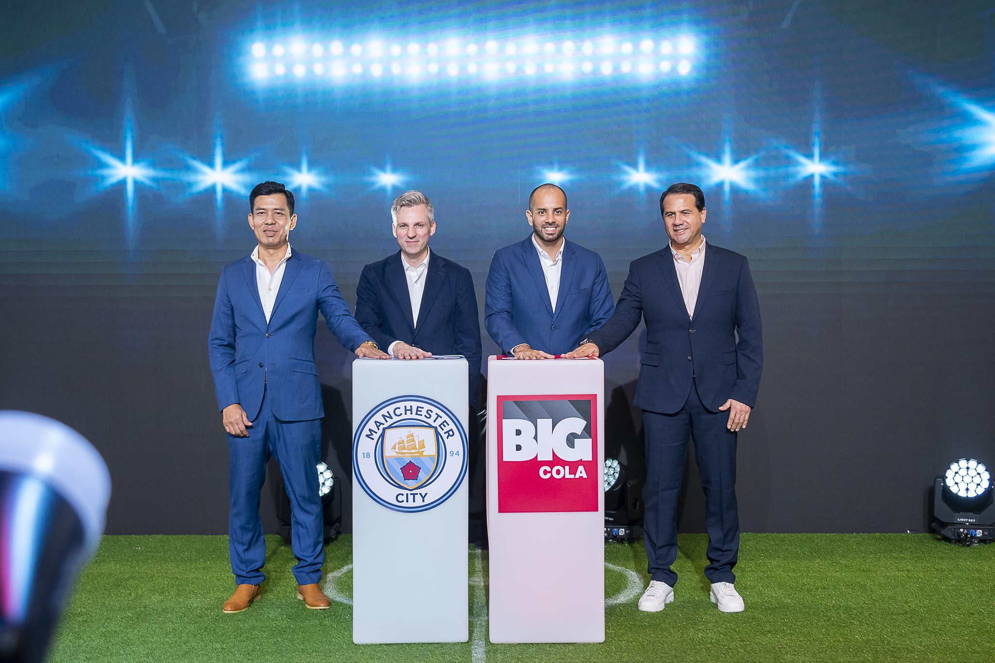 เพื่อตอกย้ำความเป็นโกลบอล แบรนด์อย่างแท้จริง บริษัทจึงได้เซ็นสัญญา เป็น Official Regional Partner กับสโมสรฟุตบอล “แมนเชสเตอร์ ซิตี้” สโมสรแรกที่ได้แชมป์พรีเมียร์ลีก 4 ฤดูกาลติดต่อกัน โดยมีระยะเวลาสัญญา 2 ปี ในการนำตราสัญลักษณ์สโมสร (CREST) นักฟุตบอล และสิทธิประโยชน์อื่นๆ มาทำกิจกรรมการตลาด ซึ่งกีฬาฟุตบอลถือเป็นกีฬาที่คนไทยให้ความนิยมอันดับ 1 โดยเฉพาะฟุตบอลพรีเมียร์ลีก ประเทศอังกฤษ ซึ่งเป็นลีกระดับโลกที่คนไทยชื่นชอบเป็นอันดับ 1 เช่นกัน ทำให้เชื่อมั่นว่า จะสามารถสร้างให้แบรนด์บิ๊กโคล่า กลับมาแข็งแรง และขยายฐานลูกค้าคนรุ่นใหม่ ซึ่งเป็นกลุ่มเป้าหมายเดียวกับแมนฯซิตี้ ที่ต้องการขยายฐานแฟนคลับ โดยเฉพาะคนรุ่นใหม่ในอาเซียนให้มากขึ้นด้วย