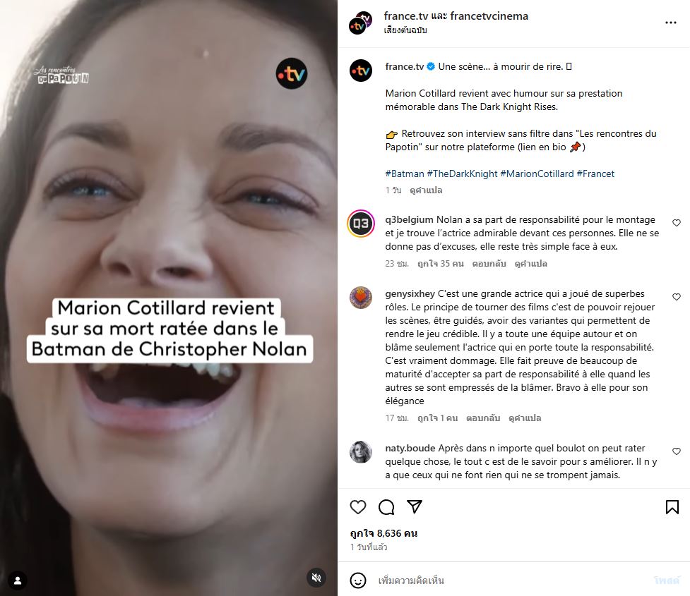 มาริยง โกติยาร์ด กลับมาพูดถึงฉากการตายของตัวละคร “ทาเลีย อัล กุล” ในภาพยนตร์ The Dark Knight Rises ที่กำกับโดยคริสโตเฟอร์ โนแลน ซึ่งออกฉายในปี 2012 โดยเธอยอมรับว่า “บางครั้งมันก็เกิดขึ้นที่เราทำอะไรพลาด และฉันก็พลาดในฉากนั้น”