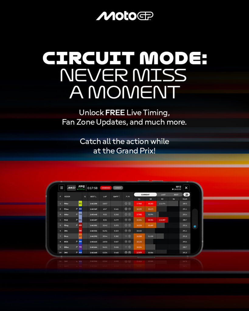 ดอร์น่า สปอร์ตเปิด โหมด Circuit Mode บนแอพพลิเคชั่น MotoGP™ ที่สร้างขึ้น เพื่อให้แฟนๆในสนามได้เกาะติดข้อมูลการแข่งขันแบบ Real Time ที่ CIRCUIT MODE ทั้ง ตารางอันดับเวลาแบบเรียลไทม์ Live Timing, ตารางเวลาโซนกิจกรรม, สูจิบัตรไทยจีพี และอื่นๆอีกมากมาย