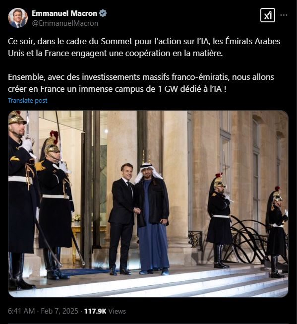 การประกาศนี้เกิดขึ้นในวันพฤหัสบดีที่ 6 กุมภาพันธ์ โดยมีการลงนามในข้อตกลงความร่วมมือด้าน AI ระหว่างฝรั่งเศสและสหรัฐอาหรับเอมิเรตส์ โดยมีประธานาธิบดีเอ็มมานูเอล มาครง ของฝรั่งเศส และเจ้าชายโมฮัมเหม็ด บิน ซาเยด อัล-นาห์ยาน แห่ง UAE เข้าร่วมการลงนามในกรุงปารีส