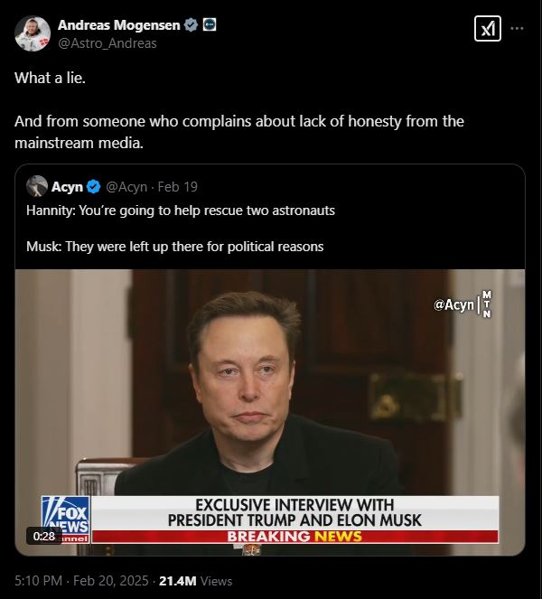 อีลอน มัสก์ ได้วิจารณ์อย่างรุนแรงต่อนักบินอวกาศยุโรป อันเดรียส โมเกนเซน หลังจากที่โมเกนเซนกล่าวหาว่า มัสก์ พูดเท็จเกี่ยวกับกรณีของบัช วิลมอร์ และซูนี วิลเลียมส์ นักบินอวกาศอเมริกันที่ติดอยู่ในอวกาศมานานกว่า 8 เดือน โดยมัสก์กล่าวว่าพวกเขาถูก “ทิ้งไว้ที่นั่นเพราะเหตุผลทางการเมือง” ซึ่งโมเกนเซนปฏิเสธและเรียกคำกล่าวของมัสก์ว่า “การพูดเท็จ”