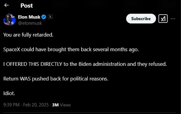 มัสก์ตอบกลับทันทีด้วยคำพูดรุนแรงบน X ระบุว่า “คุณเป็นคนโง่” และยืนยันว่า SpaceX สามารถพานักบินอวกาศทั้งสองกลับได้ตั้งแต่หลายเดือนก่อน แต่ถูกปฏิเสธจากรัฐบาลไบเดน ในขณะที่โมเกนเซนก็ย้อนกลับไปว่า ภารกิจ Crew 9 ของ SpaceX จะพาพวกเขากลับตามกำหนดการเดิมในเดือนกันยายน