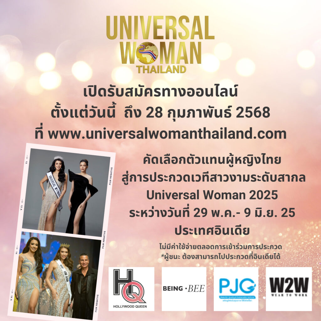 Universal Woman 2025 เวทีการประกวดนางงามระดับสากลซึ่งกำลังจัดขึ้นเป็นปีที่ 3 ต้อนรับผู้เข้าร่วมที่มีอายุตั้งแต่ 25 ถึง 45 ปี สามารถเข้าร่วมได้โดยไม่มีข้อกำหนดเกี่ยวกับส่วนสูง น้ำหนัก หรือสถานภาพการสมรส เพราะนี่คือยุคใหม่ของความงามที่ความงามเปล่งประกายผ่านความมั่นใจในตัวเองและผลกระทบเชิงบวกที่ผู้หญิงสร้างขึ้นในสังคม กองประกวด Universal Woman Thailand 2025 ร่วมเฟ้นหาผู้หญิงไทยเพื่อคัดเลือกเป็นตัวแทนจากประเทศไทยหนึ่งเดียวสู่การเข้าร่วมการประกวดเวทีนางงามระดับสากล Universal Woman 2025 เวทีที่ผู้หญิงที่มีเอกลักษณ์ที่โดดเด่นกว่า 50 ประเทศร่วมประกวด ซึ่งจะจัดขึ้นในวันที่ 29 พฤษภาคม – 9 มิถุนายน 2025 ณ ประเทศอินเดีย