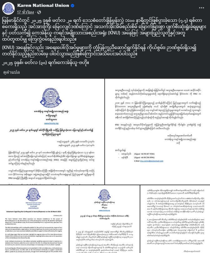 เมื่อวันอาทิตย์ที่ผ่านมา กลุ่มต่อต้านการปกครองของกองทัพเมียนมาได้วิจารณ์การโจมตีทางอากาศของกองทัพเมียนมาที่มุ่งเป้าไปที่พื้นที่พลเรือน แม้ในขณะที่ประเทศกำลังเผชิญกับผลกระทบจากแผ่นดินไหวที่คร่าชีวิตผู้คนไปกว่า 1,700 ราย โดยกลุ่ม Karen National Union (KNU) หรือ สหภาพแห่งชาติกะเหรี่ยง ซึ่งเป็นหนึ่งในกลุ่มกองทัพชาติพันธุ์ที่เก่าแก่ที่สุดของเมียนมา กล่าวในแถลงการณ์ว่า กองทัพเมียนมายังคงโจมตีพื้นที่พลเรือนแม้ในช่วงเวลาที่ประชาชนต้องเผชิญกับวิกฤตจากแผ่นดินไหว