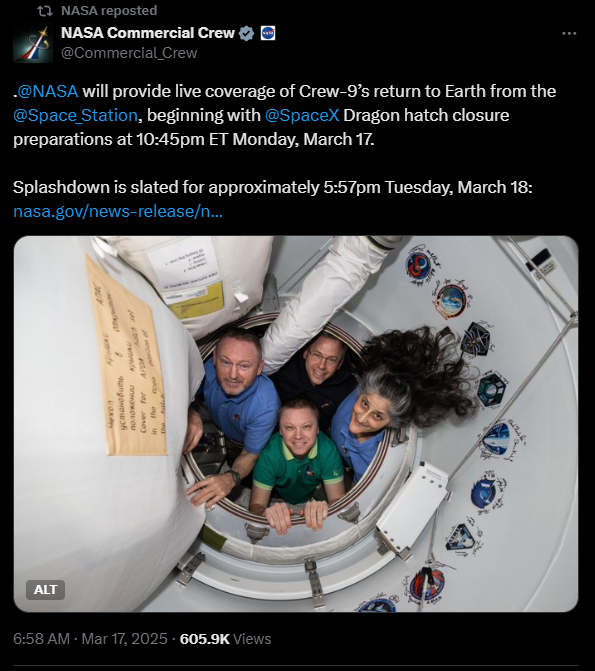 หลังจากที่ติดอยู่บนสถานีอวกาศนานาชาติ (ISS) มากว่าเก้าเดือน นักบินอวกาศชาวอเมริกันสองคน Butch Wilmore และ Suni Williams เตรียมกลับสู่โลกในวันอังคารนี้ โดยจะเดินทางกลับด้วยยาน Crew Dragon ของบริษัท SpaceX ที่เชื่อมต่อกับ ISS ตั้งแต่วันอาทิตย์ที่ผ่านมา ทั้งคู่จะเดินทางพร้อมกับนักบินอวกาศอเมริกันคนอื่นและนักบินอวกาศชาวรัสเซียหนึ่งคน