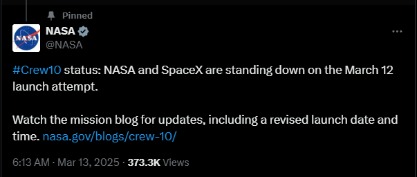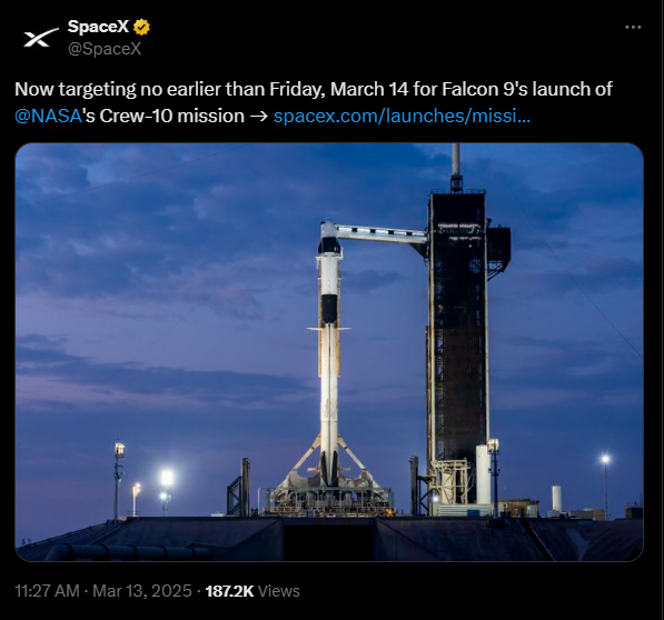 ภารกิจส่งมนุษย์อวกาศ Crew-10 ของ NASA ไปยังสถานีอวกาศนานาชาติ (ISS) ด้วยยาน SpaceX ถูกเลื่อนออกไป เนื่องจากปัญหาทางเทคนิค โดยภารกิจนี้มีเป้าหมายเพื่อนำตัวนักบินอวกาศชาวอเมริกันสองคน ที่ติดอยู่บน ISS นานกว่า 9 เดือน กลับสู่โลก เดิมทีมีกำหนดปล่อยจรวดจากแหลมคานาเวอรัลเมื่อวันที่ 12 มีนาคม เวลา 19:48 น. (ตามเวลาท้องถิ่น) แต่ถูกยกเลิกก่อนเวลาออกเดินทางเพียง 45 นาที