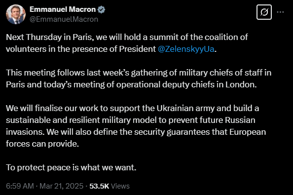 ประธานาธิบดีเอ็มมานูเอล มาครง ประกาศจัดประชุมสุดยอดของ “พันธมิตรอาสา” ในวันที่ 27 มีนาคมนี้ ที่กรุงปารีส โดยจะมีประธานาธิบดีโวโลดีมีร์ เซเลนสกี และผู้นำยุโรปร่วมประชุม เป้าหมายหลักของการประชุมคือการสรุปมาตรการสนับสนุนระยะสั้นให้กับกองทัพยูเครน และหารือเกี่ยวกับหลักประกันความมั่นคงที่ยุโรปสามารถให้ได้