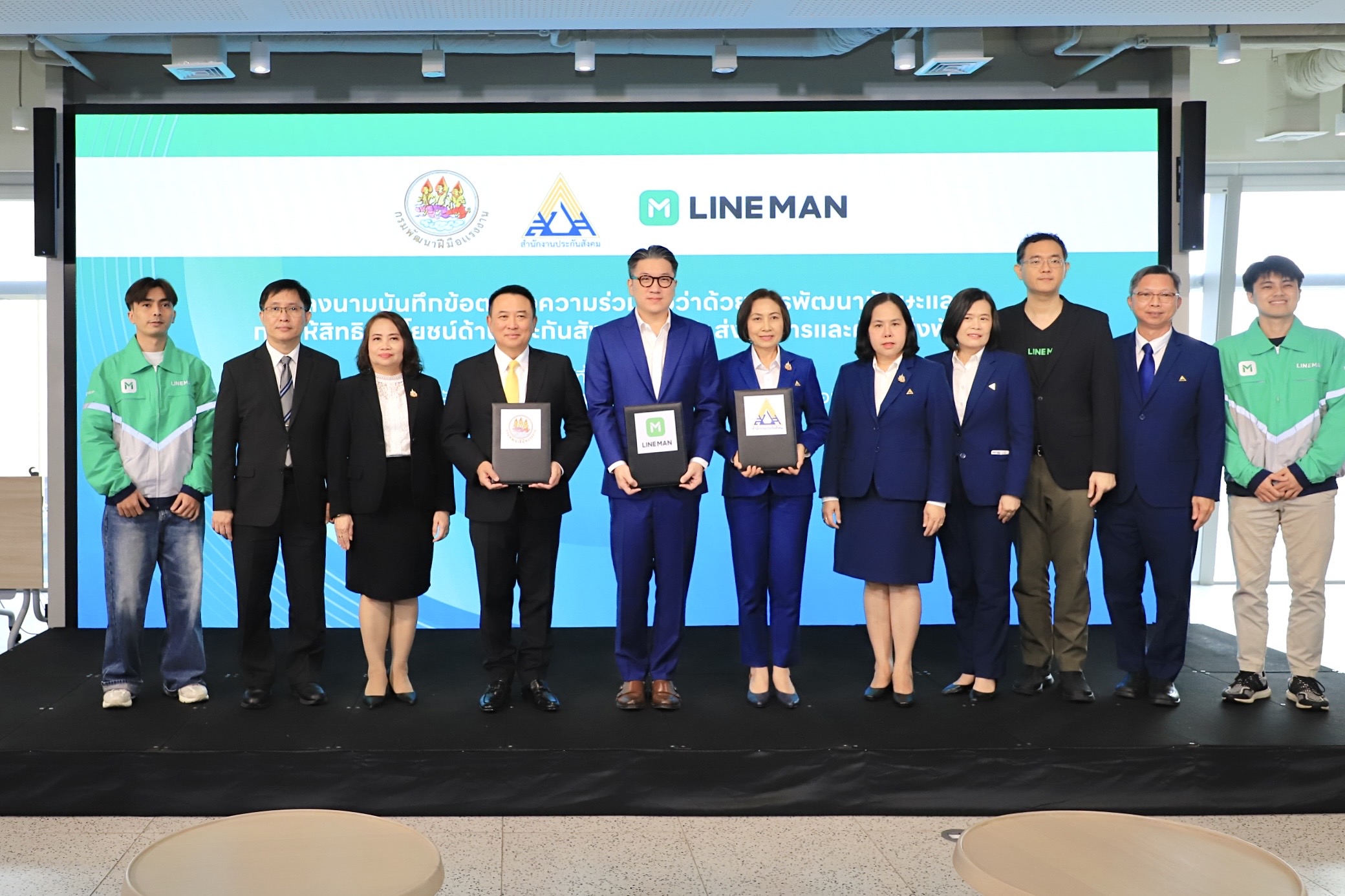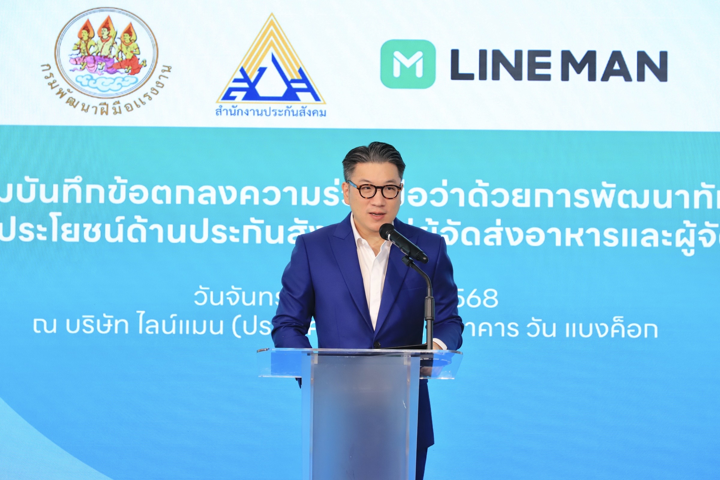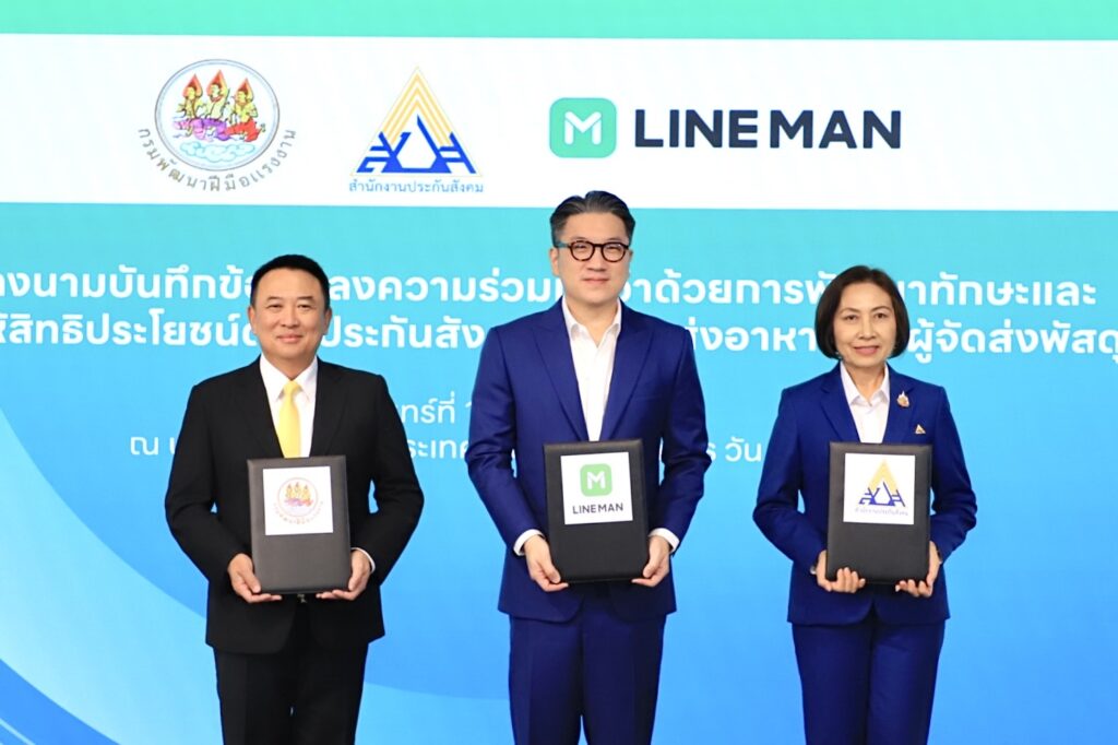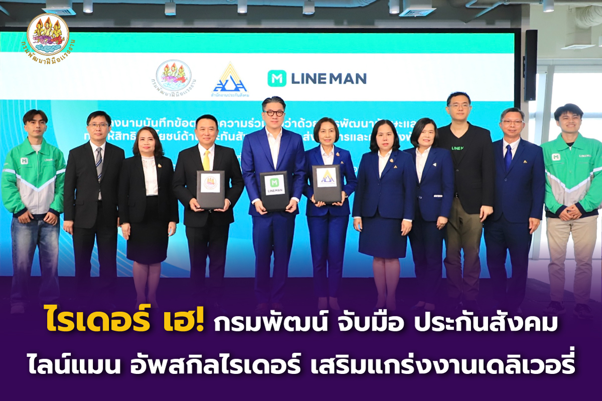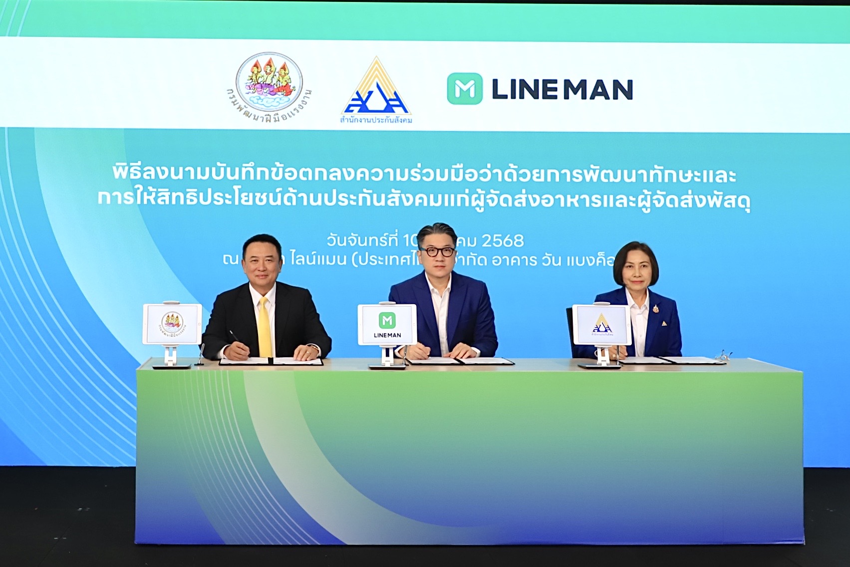 วันที่ 10 มีนาคม 2568 นายเดชา พฤกษ์พัฒนรักษ์ อธิบดีกรมพัฒนาฝีมือแรงงาน ลงนามบันทึกข้อตกลงความร่วมมือว่าด้วยการพัฒนาทักษะและการให้สิทธิประโยชน์ด้านประกันสังคมแก่ผู้จัดส่งอาหารและผู้จัดส่งพัสดุ ระหว่างกรมพัฒนาฝีมือแรงงาน กับ นางมารศรี ใจรังษี เลขาธิการสำนักงานประกันสังคม และนายยอด ชินสุภัคกุล ประธานเจ้าหน้าที่ บริษัท ไลน์แมน (ประเทศไทย) จำกัด โดยมี นางจิรวรรณ สุตสุนทร รองอธิบดีกรมพัฒนาฝีมือแรงงาน นางนงค์ลักษณ์ กอวรกุล รองเลขาธิการสำนักงานประกันสังคม และนายอิสริยะ ไพรีพ่ายฤทธิ์ รองประธานฝ่ายนโยบายสาธารณะและรัฐกิจสัมพันธ์ บริษัท ไลน์แมน (ประเทศไทย) จำกัด เป็นสักขีพยาน ณ Town Hall ชั้น 24 สำนักงานบริษัท ไลน์แมน (ประเทศไทย) จำกัด อาคารทาวเวอร์ 4 วัน แบงค็อก เขตปทุมวัน กรุงเทพมหานคร