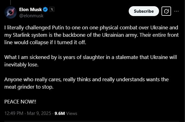 อีลอน มัสก์ ผ่อนคลายท่าทีต่อโวโลดีเมียร์ เซเลนสกี โดยยืนยันเมื่อวันอาทิตย์ว่า Starlink จะยังคงให้บริการแก่ยูเครน แม้เขาจะมี “ความไม่เห็นด้วย” กับนโยบายของรัฐบาลยูเครนก็ตาม มัสก์โพสต์บน X ว่า “เพื่อให้ชัดเจนที่สุด ไม่ว่าอย่างไร Starlink จะไม่ปิดตัวลง” พร้อมย้ำว่า “หากไม่มี Starlink เครือข่ายสื่อสารของยูเครนจะล่มสลาย เพราะรัสเซียสามารถรบกวนช่องทางอื่นทั้งหมด” และยืนยันว่าเขาจะไม่ใช้ Starlink เป็นเครื่องมือในการต่อรอง