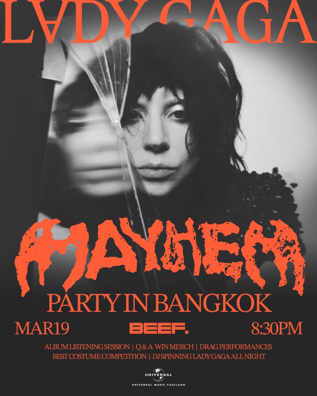 เพื่อเป็นการเฉลิมฉลองการกลับมาอย่างยิ่งใหญ่ของ Mother Monster ของพวกเรา Universal Music Thailand ขอเชิญเหล่า Thai Little Monsters ทุกคนลุ้นเป็นผู้โชคดี 200 คนที่จะได้โปสเตอร์ MAYHEM และได้เข้าร่วมงาน LADY GAGA – MAYHEM PARTY IN BANGKOK ที่เราจะได้ฟังเพลงจากอัลบั้ม MAYHEM ไปด้วยกันกับคนที่รัก Lady Gaga ชมโชว์สุดจัดเต็มจากเหล่า Drag Queens ชื่อดัง และยังได้ร่วมลุ้นรางวัลต่างๆ สุด Exclusive ภายในงานผ่านเกมตอบคำถามสนุกๆ และการประกวด Best Costume ในธีม MAYHEM ด้วยกัน