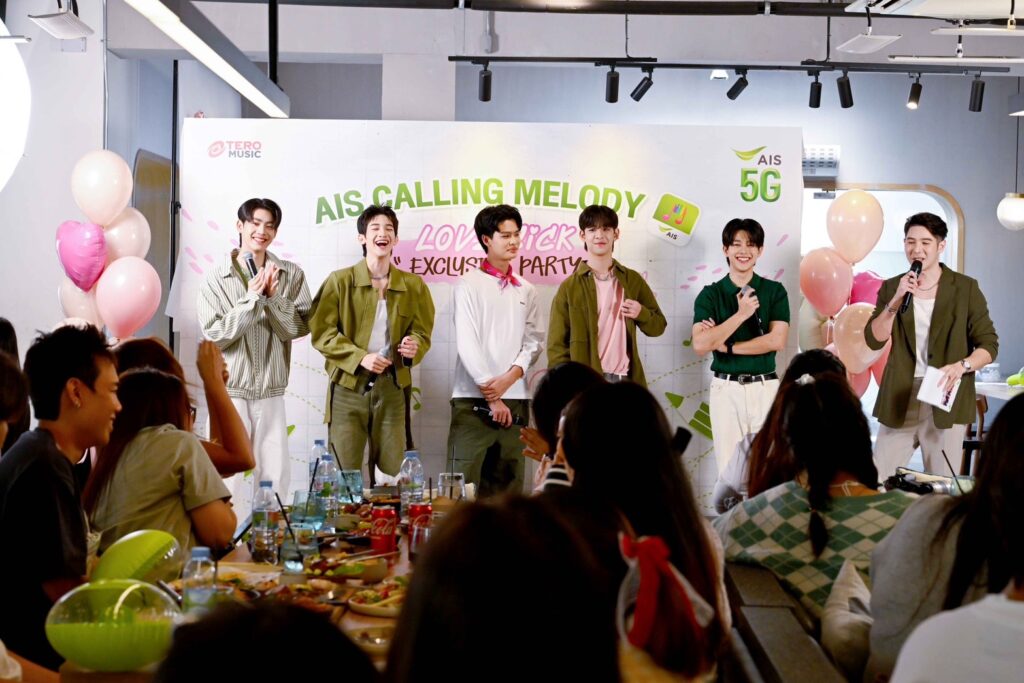 งานนี้ Tero Music จัดขึ้นเป็นพิเศษสำหรับผู้โชคดีลูกค้า AIS  ทั้งหมด  40  คน ที่ร่วมสนุกดาวน์โหลดเพลงรอสาย AIS Calling Melody  เพลงประกอบซีรีส์ “LoveSick 2024 ชุลมุนกางเกงน้ำเงิน” หรือ เพลงจากค่าย Tero Music  ผ่านแอปพลิเคชั่น  Calling Melody หรือเว็บไซต์ https://www.ais.th/callingmelody   หรือดาวน์โหลดวิดีโอ         รอสาย  VDO Calling Melody หรือที่เว็บไซต์ https://www.ais.th/vdocalling   ที่ 5 หนุ่ม แอลม่อน,โปรเกรส,กฤษฎิ์,เชน และ สกาย จัดคอนเทนต์พิเศษให้แฟนๆ ได้ฟินผ่านหน้าจอมือถือและเสียงรอสาย  ความพิเศษเริ่มต้นขึ้น โดยมี แพทริค-กันต์กวี ไมเกิ้ล  จากคลื่น Eazy FM 102.5 มารับหน้าที่พิธีกรหนุ่มสร้างสีสันและเสียงหัวเราะให้กับงาน ด้วยการเปิดเวทีต้อนรับ 5 หนุ่ม มาพูดคุยถึงความรู้สึกที่ได้มาร่วมแฟนมีตสุดเอ็กซ์คลูซีฟในครั้งนี้ พร้อมเล่าโมเมนต์ประทับใจที่ได้มาร่วมงานกัน และโชว์ร้องท่อนแร๊ฟเพลงสั่น เพลงประกอบซีรีส์ “LoveSick 2024 ชุลมุนกางเกงน้ำเงิน”