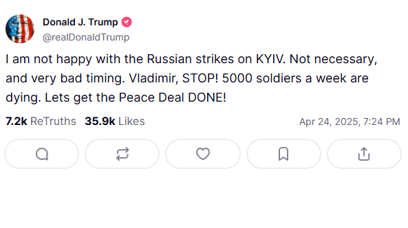 ประธานาธิบดีโดนัลด์ ทรัมป์ ของสหรัฐฯ ออกมาประณามรัสเซียอย่างตรงไปตรงมาในโพสต์ Truth Social โดยกล่าวว่า “ผมไม่พอใจกับการโจมตีเคียฟครั้งนี้เลย มันไม่จำเป็น และเกิดขึ้นในช่วงเวลาที่เลวร้ายมาก วลาดิเมียร์ หยุดเดี๋ยวนี้! มีทหารตายสัปดาห์ละ 5,000 คน เรามาทำข้อตกลงสันติภาพกันเถอะ!” ทรัมป์ยังเผยว่ากำลังกดดันทั้งรัสเซียและยูเครนให้เร่งเจรจาสันติภาพ และระบุว่ามีความคืบหน้าสำคัญ โดยรัสเซียยอมถอยบางจุดในการเจรจา ขณะเดียวกัน รัฐบาลสหรัฐฯ เตือนว่า หากไม่มีความคืบหน้าอาจยุติความพยายามไกล่เกลี่ยทั้งหมด