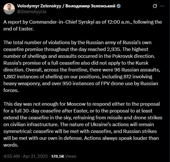 ตลอดวันอาทิตย์ที่รัสเซียอ้างว่า “หยุดยิง” กองทัพยูเครนระบุว่าเกิดการละเมิดหยุดยิงมากถึง 3,000 ครั้ง โดยมีการยิงถล่มและปะทะอย่างหนักบริเวณแนวรบใกล้เมืองโปโครฟสค์ ส่วนทางการรัสเซียกลับกล่าวหายูเครนว่าเป็นฝ่ายยิงตอบโต้มากกว่า 900 ครั้ง และส่งโดรนเข้าโจมตีบริเวณชายแดน ส่งผลให้เกิดความสูญเสียในหมู่พลเรือน ทั้งนี้เครมลินยืนยันว่าจะไม่มีการขยายระยะเวลาหยุดยิงออกไปอีก โดยโฆษกดมิทรี เปสคอฟ ระบุว่า “ไม่มีคำสั่งใดเพิ่มเติมจากประธานาธิบดี”