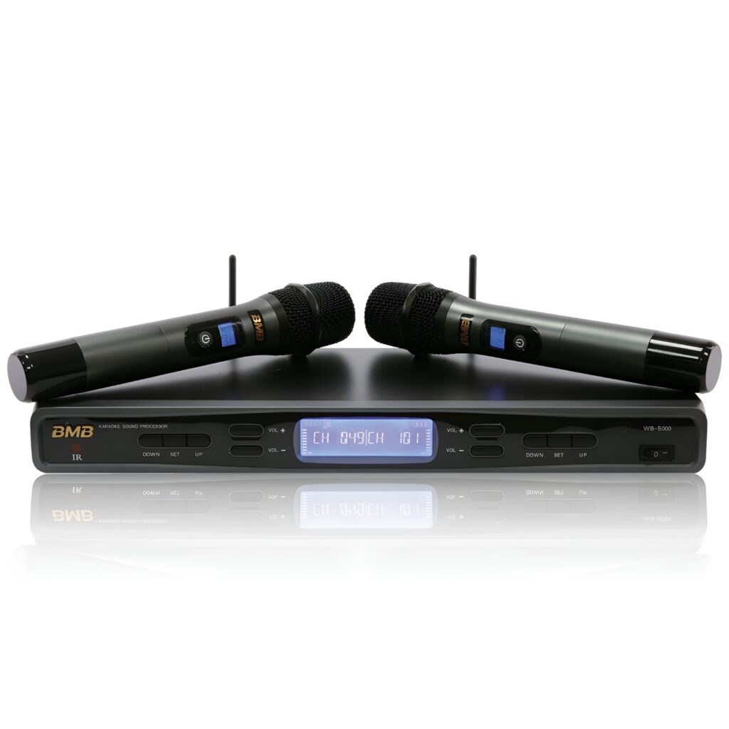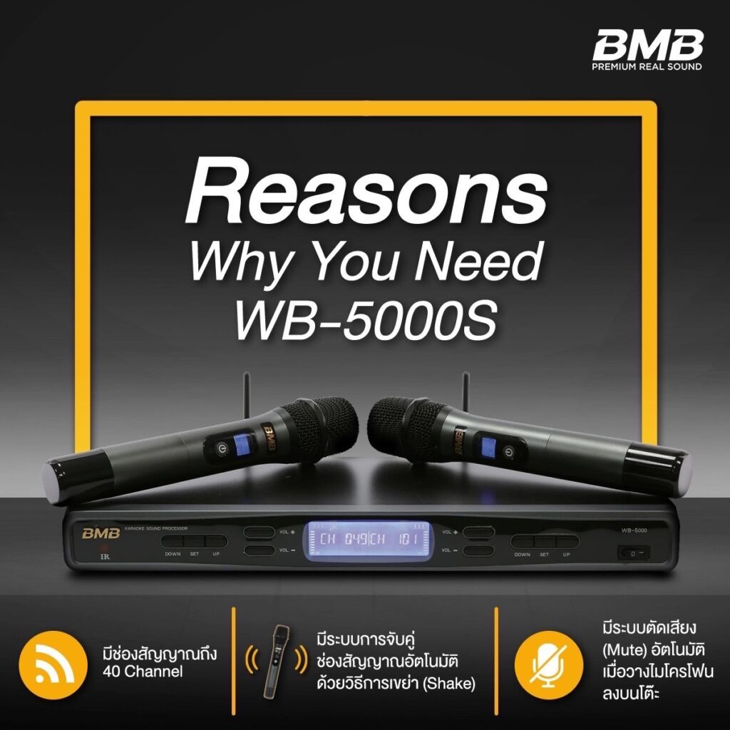 - BMB WB-5000S ไมโครโฟนคู่ไร้สายแบบมือถือ ระบบ UHF ความถี่ 748–758 MHz รองรับการใช้งานได้ไกลถึง 50 เมตร (ในพื้นที่โล่ง) ให้เสียงคมชัด ไร้สัญญาณสะดุด ตัวไมค์เป็นแบบยูนิไดเร็คชันนอล จับเสียงเฉพาะทิศทาง ลดเสียงรบกวนรอบข้าง มาพร้อมระบบจับคู่ช่องสัญญาณอัตโนมัติด้วยการเขย่า (Shake Pairing) และฟังก์ชันปิดเสียงอัตโนมัติเมื่อไมค์วางพัก ตัวไมโครโฟนรองรับแบตเตอรี่ Lithium-ion หรือ AA Alkaline ใช้งานต่อเนื่องได้ยาวนาน ครบฟังก์ชันสำหรับการใช้งานที่ต้องการคุณภาพเสียงเป็นหลัก ในราคา 18,900 บาท
