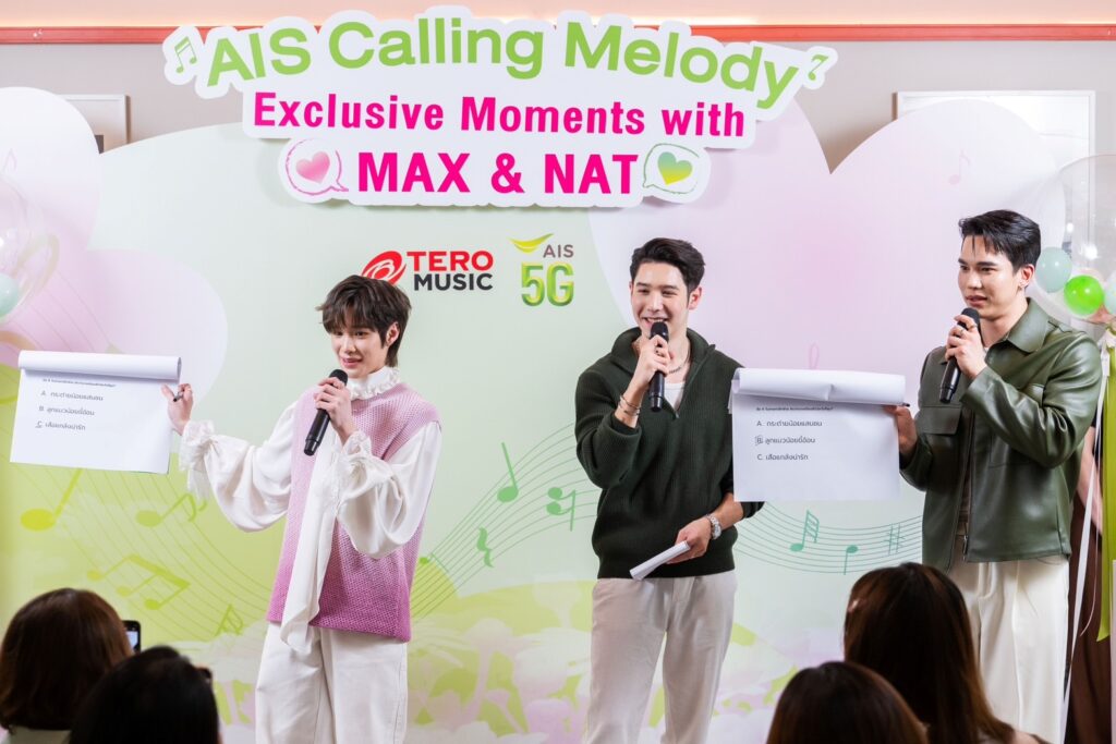 จัดหนักแบบไม่มีกั๊ก!! ให้ชาวด้อมฮาร์ทดิสได้ Fun&Fin ในบรรยากาศสุดอบอุ่น สำหรับกิจกรรม “AIS Calling Melody Exclusive Moments with MAX & NAT” ที่จัดเอาใจลูกค้า AIS ร่วมสนุกเป็นผู้โชคดี 40 คนดาวน์โหลดเพลงรอสาย Calling Melody ,Calling Maker, Calling Station จากค่าย TERO MUSIC หรือดาวน์โหลดวิดีโอรอสาย VDO Calling Melody คอนเทนต์พิเศษจาก 2 หนุ่มคู่จิ้นคู่ใจ แม้ก-กรธัสส์ รุจีรัตนาวรพันธุ์ และ ณฐ-ณฐสิชณ์ เอื้อเอกสิชฌ์ จากซีรีส์วายสุดฮอต SUNITY มาเสิร์ฟโมเม้นต์จิ้นกับกิจกรรมความสนุก โชว์สุดพิเศษและอาหารอร่อยๆ มากมาย ในวันเสาร์ที่ 16 ส.ค.ที่ผ่านมา ณ ร้าน Baby Bar Bangkok