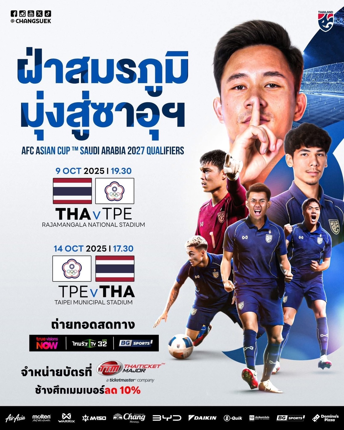 สำหรับ การแข่งขันฟุตบอล เอเชียน คัพ 2027 รอบคัดเลือก กลุ่มดี แมตช์เดย์ที่ 3 ทีมชาติไทย จะพบกับ ไชนีส ไทเป ที่ ราชมังคลากีฬาสถาน ในวันที่ 9 ตุลาคม 2568 เวลา 19.30 น. และจะไปเยือน ไชนีส ไทเป ในแมตช์เดย์ที่ 4 ที่ ไทเป มูนิซิปัล สเตเดียม วันที่ 14 ตุลาคม 2568 เวลา 17.30 น. ตามเวลาประเทศไทย ถ่ายทอดสด ทาง ไทยรัฐ ทีวี ช่อง 32, ยูทูป บีจี สปอร์ตส์ และ แอพพลิเคชั่น ทรูวิชั่นส์ นาว
