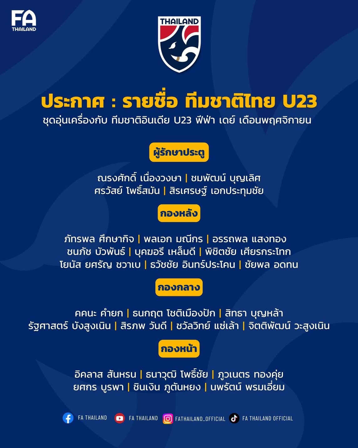 สมาคมกีฬาฟุตบอลแห่งประเทศไทย ในพระบรมราชูปถัมภ์ ประกาศรายชื่อ 23 นักฟุตบอลชายทีมชาติไทย รุ่นอายุไม่เกิน 23 ปี เตรียมความพร้อมสำหรับการแข่งขันฟุตบอลอุ่นเครื่องนัดพิเศษ ที่จะพบกับ ทีมชาติอินเดีย U23 ในช่วงฟีฟ่า เดย์ ระหว่างวันที่ 10-18 พฤศจิกายน 2568 ภายใต้การคุมทัพของ “โค้ชวัง” ธวัชชัย ดำรงอ่องตระกูล หัวหน้าผู้ฝึกสอน
