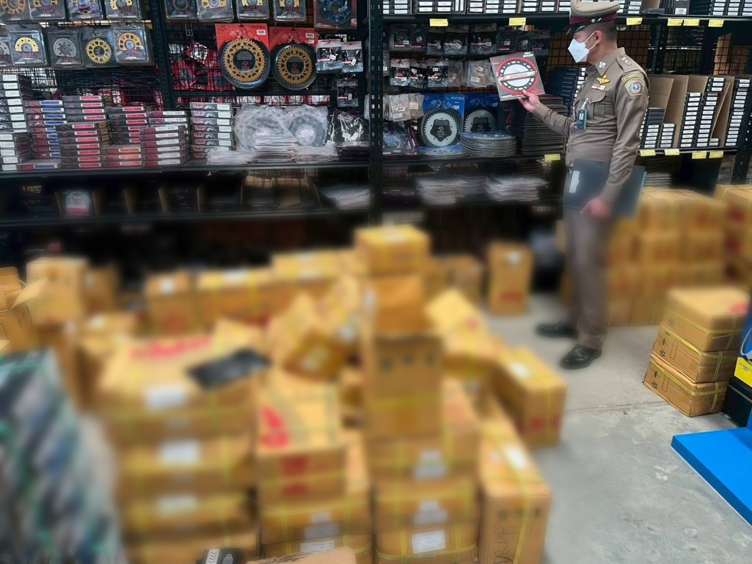 พร้อมตรวจยึดของกลาง รวม 4,718 ชิ้น มูลค่าความเสียหายมากว่า 4 ล้านบาท โดยสินค้าที่ตรวจยึดสินค้าเป็นสินค้าปลอมเครื่องหมายการค้าหลากหลายประเภท อาทิ อุปกรณ์ที่ใช้เกี่ยวกับยานพาหนะ อะไหล่ยานยนต์ยี่ห้อดัง เสื้อผ้า และรองเท้าแบรนด์เนม ยี่ห้อดัง