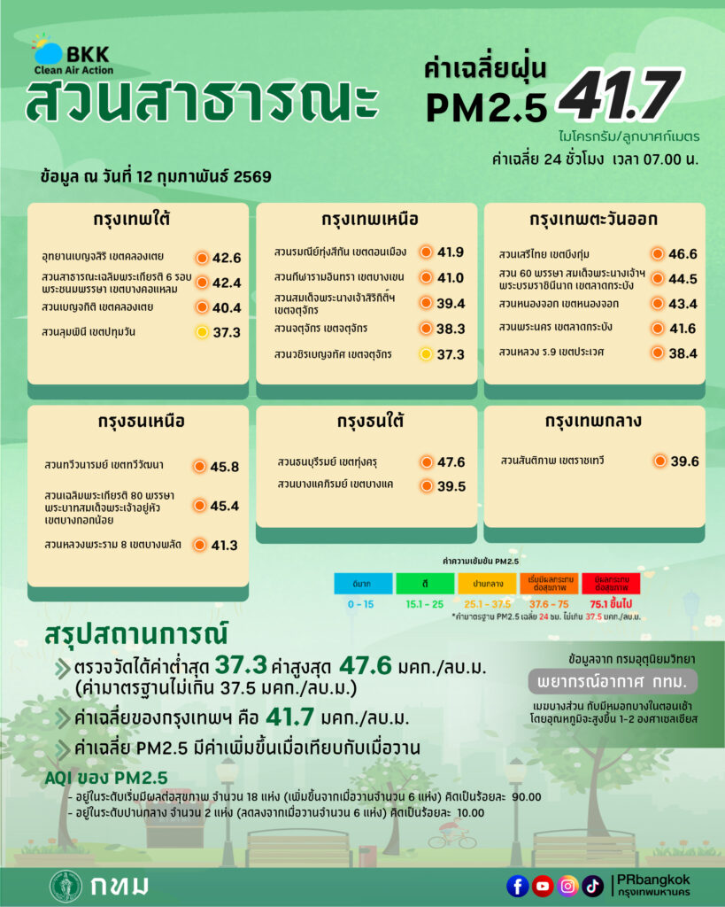 วันที่ 12 ก.พ. 69 ทีมโฆษกศูนย์ข้อมูลคุณภาพอากาศกรุงเทพมหานคร รายงานสถานการณ์ฝุ่นละอองขนาดไม่เกิน 2.5 ไมครอน (PM 2.5) เวลา 07.00 น. พบว่าค่าเฉลี่ย 24 ชั่วโมง ตรวจวัดได้ 37.3-61.6 ไมโครกรัม/ลูกบาศก์เมตร (มคก./ลบ.ม.) พบว่าเกินมาตรฐานอยู่ในระดับสีส้ม เริ่มมีผลกระทบต่อสุขภาพ (มาตรฐานไม่เกิน 37.5 มคก./ลบ.ม.) จำนวน 68 พื้นที่ คือ