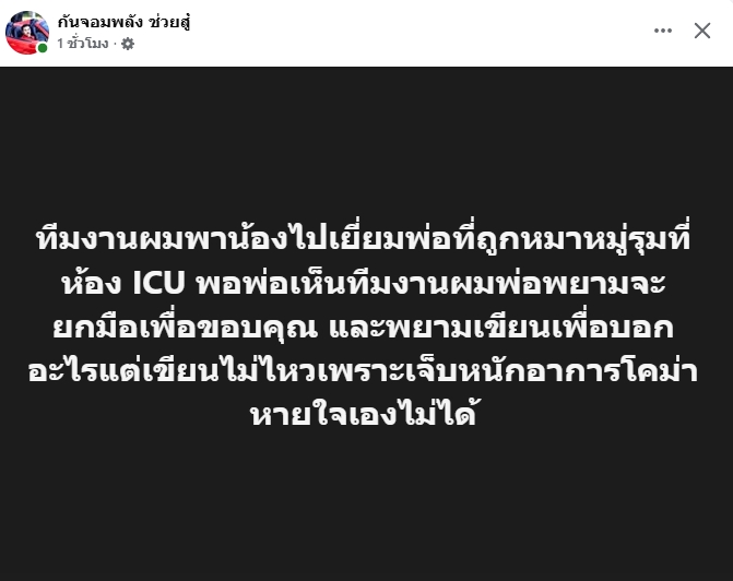 ล่าสุด วันนี้ (27 ก.พ. 69) กัน จอมพลัง โพสต์ข้อความผ่านเฟซบุ๊กว่า “ทีมงานผมพาน้องไปเยี่ยมพ่อที่ถูกหมาหมู่รุมที่ห้อง ICU พอพ่อเห็นทีมงานผมพ่อพยายามจะยกมือเพื่อขอบคุณ และพยายามเขียนเพื่อบอกอะไรแต่เขียนไม่ไหวเพราะเจ็บหนักอาการโคม่าหายใจเองไม่ได้”