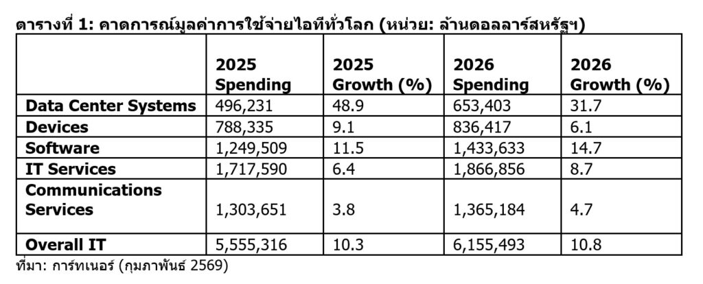 สำหรับมูลค่าการใช้จ่ายไอทีของประเทศไทยในปีนี้ (2569) การ์ทเนอร์คาดการณ์ว่าจะมียอดสูงเกือบ 1.1 ล้านล้านบาท เพิ่มขึ้น 8.36% จากปี 2568