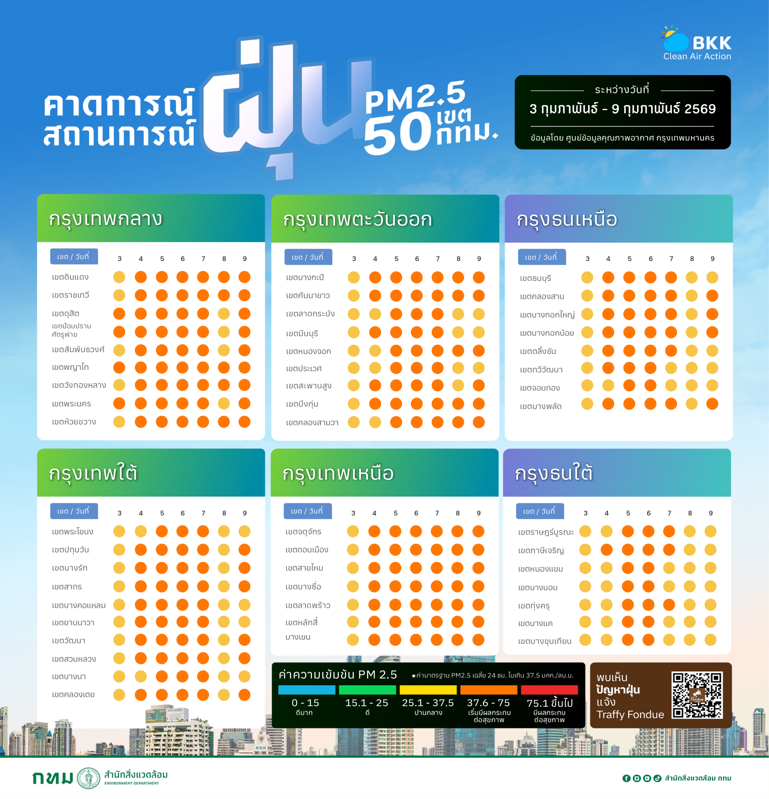 วันที่ 2 กุมภาพันธ์ 2569 ทีมโฆษกศูนย์ข้อมูลคุณภาพอากาศกรุงเทพมหานคร รายงานสถานการณ์ฝุ่น PM 2.5 ช่วงเวลา 05.00-07.00 น. ตรวจวัดได้ระหว่าง 25.3-45.3 ไมโครกรัมต่อลูกบาศก์เมตร โดยค่าเฉลี่ยของกรุงเทพมหานครอยู่ที่ 33.2 ไมโครกรัมต่อลูกบาศก์เมตร ซึ่งยังไม่เกินค่ามาตรฐานที่กำหนดไม่เกิน 37.5 ไมโครกรัมต่อลูกบาศก์เมตร อย่างไรก็ตาม พบพื้นที่ที่มีค่าเกินมาตรฐานจำนวน 15 พื้นที่ แม้ภาพรวมจะมีแนวโน้มลดลง