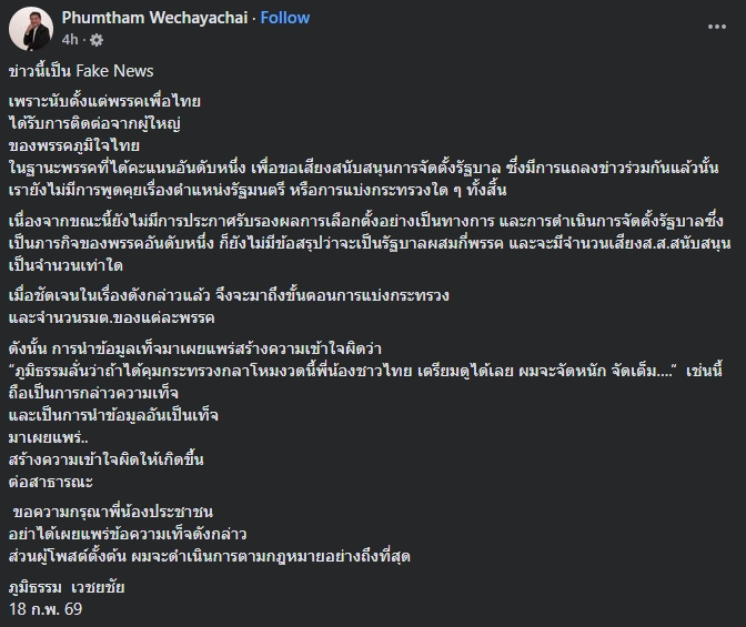 “ภูมิธรรมลั่นว่าถ้าได้คุมกระทรวงกลาโหมงวดนี้พี่น้องชาวไทย เตรียมดูได้เลย ผมจะจัดหนัก จัดเต็ม….“ เช่นนี้ ถือเป็นการกล่าวความเท็จ และเป็นการนำข้อมูลอันเป็นเท็จมาเผยแพร่.. สร้างความเข้าใจผิดให้เกิดขึ้นต่อสาธารณะ ขอความกรุณาพี่น้องประชาชน อย่าได้เผยแพร่ข้อความเท็จดังกล่าว ส่วนผู้โพสต์ตั้งต้น ตนจะดำเนินการตามกฎหมายอย่างถึงที่สุด