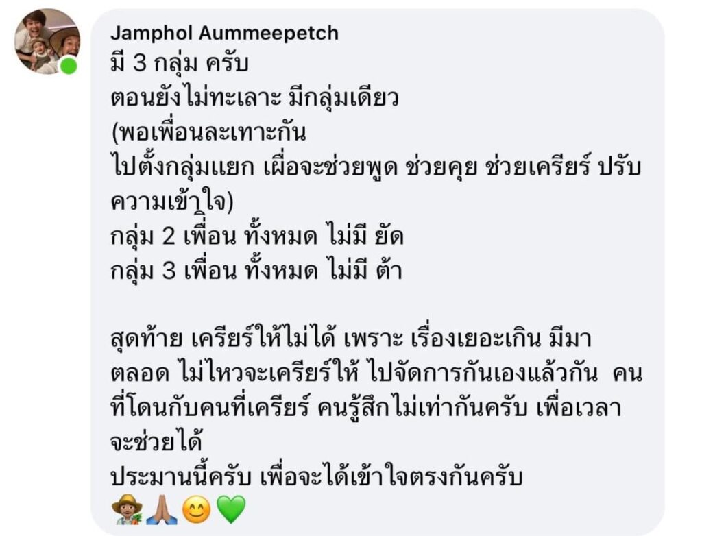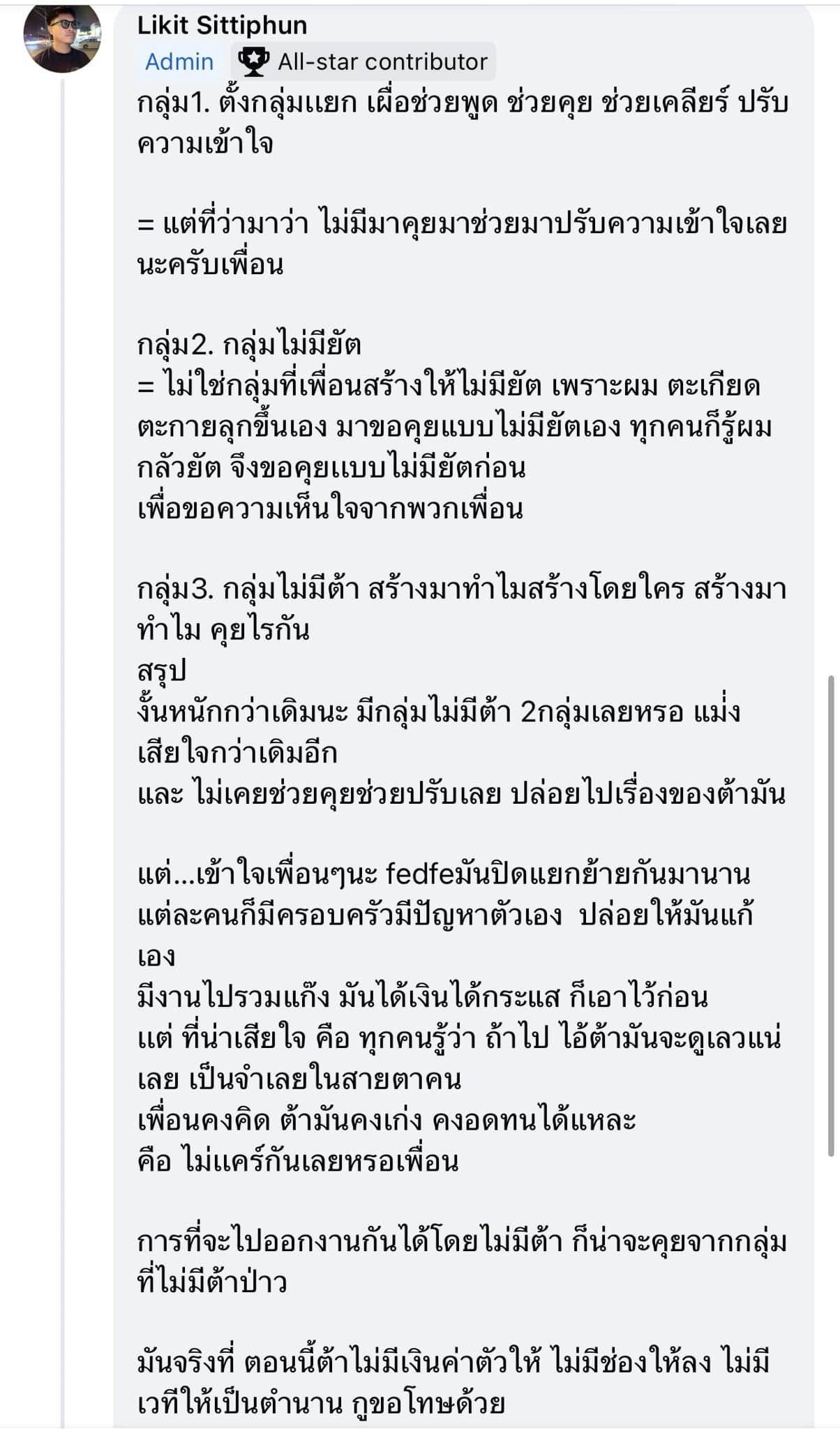 “กลุ่ม 1. ตั้งกลุ่มแยก เผื่อช่วยพูด ช่วยคุย ช่วยเคลียร์ ปรับความเข้าใจ = แต่ที่ว่ามาว่า ไม่มีมาคุยมาช่วยมาปรับความเข้าใจเลยนะครับเพื่อน