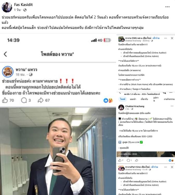 “ช่วยแชร์หน่อยครับ เพื่อนโดนหลอกไปปอยเปต ติดต่อไม่ได้ 2 วันแล้ว ตอนนี้ทางครอบครัวแจ้งความเรียบร้อยแล้ว ตอนนี้เฟซบุ๊กโดนแฮ็ก ช่วยเข้าไปสแปมให้หน่อยครับ ยังมีการใช้งานไปโพสต์ในหลาย ๆ กลุ่ม”
