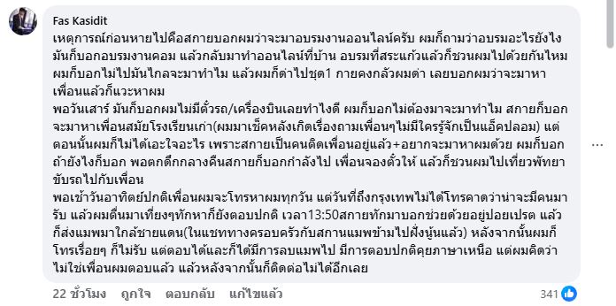 เจ้าของโพสต์ยังเผยช่วงเหตุการณ์ก่อนขาดการติดต่อว่า สกายบอกว่าจะไปอบรมงานออนไลน์ เกี่ยวกับงานคอมพิวเตอร์ โดยอ้างว่าไปอบรมที่ จ.สระแก้ว แล้วจะกลับมาทำงานออนไลน์ที่บ้าน พร้อมชักชวนให้ตนไปด้วย แต่ตนปฏิเสธเพราะมองว่าไกลเกินไป
