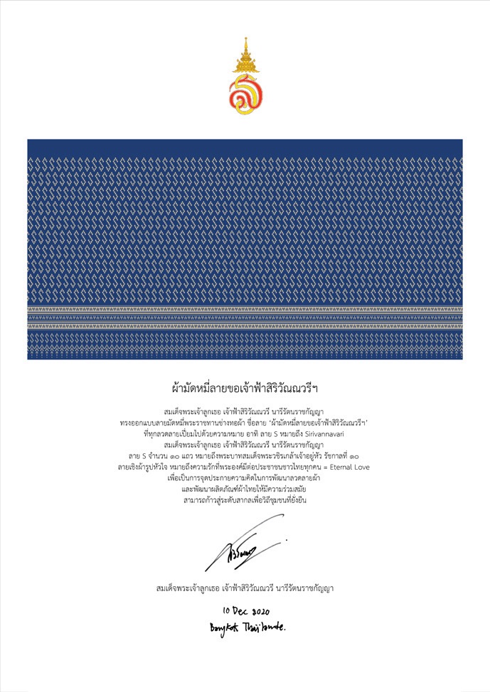 ลายผ้าพระราชทานดังกล่าว ได้รับการออกแบบโดย สมเด็จพระเจ้าลูกเธอ เจ้าฟ้าสิริวัณณวรี นารีรัตนราชกัญญา เพื่อพระราชทานแก่ชาวไทย สำหรับการสืบสาน และต่อยอดเอกลักษณ์ผ้าไทยให้ร่วมสมัย และก้าวสู่ระดับสากล โดยเป็นลายมัดหมี่ที่สื่อถึงความรัก ความสุข และความปรารถนาดีที่มีต่อประชาชนชาวไทย