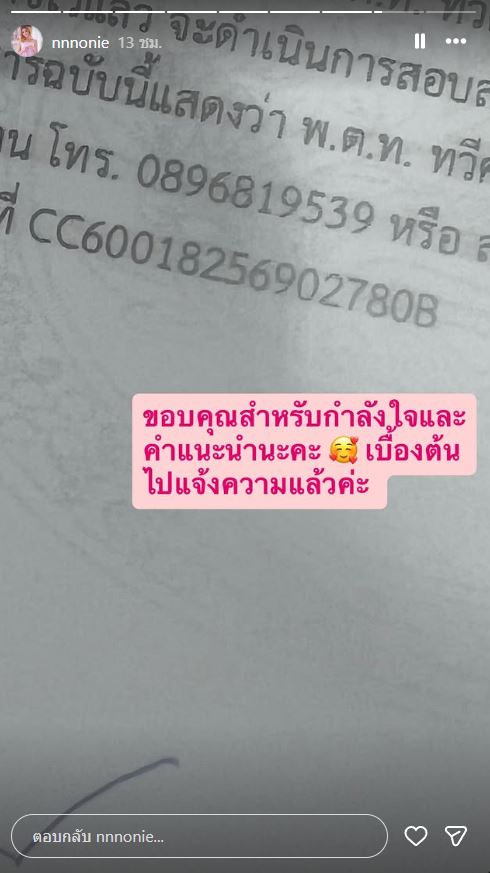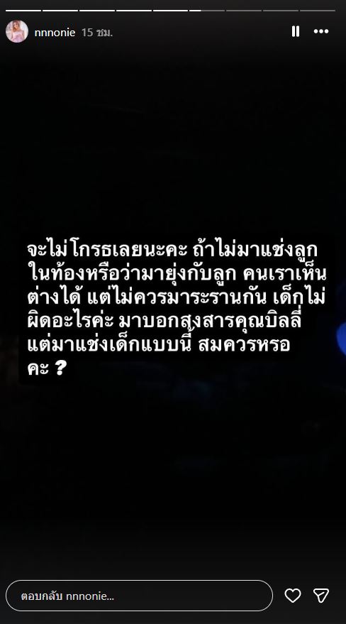 นอกจากนี้ นนนี่ ยังโพสต์ข้อความอีกว่า “จะไม่โกรธเลยนะคะ ถ้าไม่มาแช่งลูกในท้องหรือว่ามายุ่งกับลูก คนเราเห็นต่างได้ แต่ไม่ควรมาระรานกัน เด็กไม่ผิดอะไรค่ะ มาบอกสงสารคุณบิลลี่ แต่มาแช่งเด็กแบบนี้ สมควรหรอคะ?” พร้อมโพสต์ขณะอยู่ที่สถานีตำรวจดอนเมือง ยืนยันว่าได้แจ้งความดำเนินคดีกับชาวเน็ตรายดังกล่าวแล้ว
