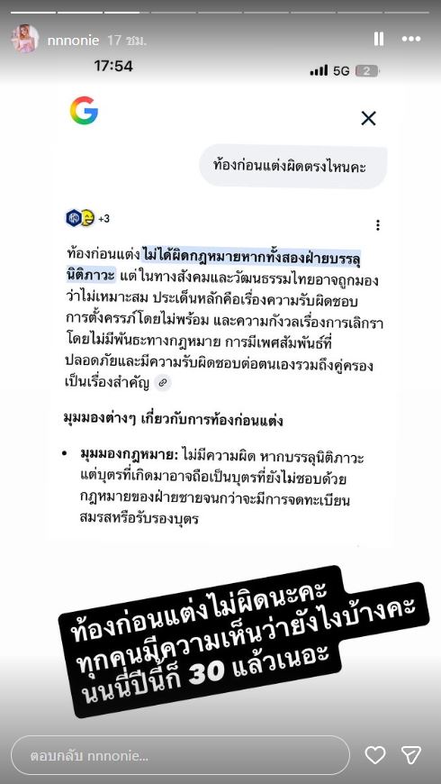 ล่าสุด นนนี่ เผยแพร่ภาพถูกชาวเน็ตรายหนึ่ง เข้ามาแซะแรง พาดพิงถึงเรื่องส่วนตัวและลูกในท้องว่า “อย่าอายเลยค่ะ พ่อยังไม่อายที่หนูท้องก่อนแต่งเลย” นนนี่ ตอบกลับว่า “ขอบคุณสำหรับความเห็นนะคะ รู้ดีจัง” ชาวเน็ตบอกอีกว่า “ยินดีค่ะ ดูแลตัวเองและลูกดี ๆ นะคะ อย่าลงหลุมนาน เดี๋ยวตายก่อน” นนนี่ ระบุว่า “ขอบคุณนะคะ แซะคนอื่นไปเรื่อย หวังว่าชีวิตจะมีความสุขนะคะ”