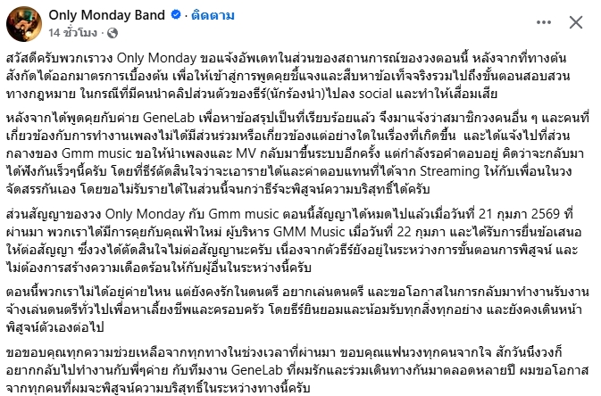 ส่วนสัญญาของวง Only Monday กับ Gmm music ตอนนี้สัญญาได้หมดไปแล้วเมื่อวันที่ 21 กุมภา 2569 ที่ผ่านมา พวกเราได้มีการคุยกับคุณฟ้าใหม่ ผู้บริหาร GMM Music เมื่อวันที่ 22 กุมภา และได้รับการยื่นข้อเสนอให้ต่อสัญญา ซึ่งวงได้ตัดสินใจไม่ต่อสัญญานะครับ เนื่องจากตัวธีร์ยังอยู่ในระหว่างการขั้นตอนการพิสูจน์ และไม่ต้องการสร้างความเดือดร้อนให้กับผู้อื่นในระหว่างนี้ครับ
