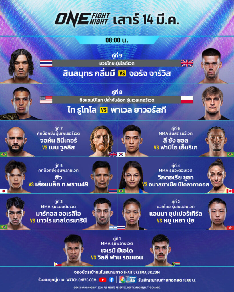 อัปเดตโปรแกรมล่าสุดของศึก ONE Fight Night 41 สินสมุทร vs จอร์จ ที่จะระเบิดความมันขึ้นในวันเสาร์ที่ 14 มีนาคมนี้ ถ่ายทอดสดจากสนามมวยเวทีลุมพินี (รามอินทรา) ในช่วงไพรม์ไทม์สหรัฐอเมริกา ตรงกับช่วงเช้าเวลา 08.00 น. ตามเวลาประเทศไทย