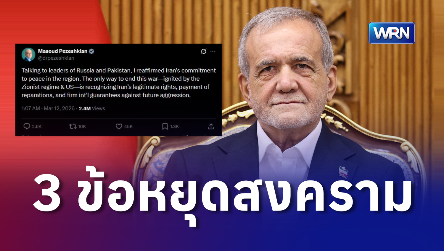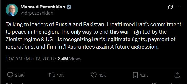 ผู้นำอิหร่านโพสต์ผ่านแพลตฟอร์ม X ระบุว่า เขาได้พูดคุยกับผู้นำรัสเซียและปากีสถาน พร้อมย้ำว่าอิหร่านต้องการสันติภาพในภูมิภาค โดยระบุว่า วิธีเดียวที่จะยุติสงคราม คือ 1. การยอมรับสิทธิอันชอบธรรมของอิหร่าน, 2. การชดใช้ความเสียหายจากสงคราม และ 3. การรับประกันจากนานาชาติว่าจะไม่เกิดการโจมตีอิหร่านอีก