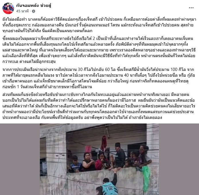 ด้าน นายกัณฐัศว์ พงศ์ไพบูลย์เวชย์ หรือ “กัน จอมพลัง” เสนอแนวคิดกับกองทัพเรือให้นำทีมแชมป์โลกเจ็ตสกีเข้าช่วยเหลือ โดยมองว่าอาจเป็นอีกทางเลือกในการเข้าถึงเรือ เนื่องจากยานขนาดเล็กอย่างเรือยาง หรือเจ็ตสกี อาจเป็นเป้าหมายการโจมตีน้อยกว่าเรือขนาดใหญ่ อย่างไรก็ตาม แนวคิดดังกล่าวได้จุดกระแสวิพากษ์วิจารณ์ถึงความเป็นไปได้