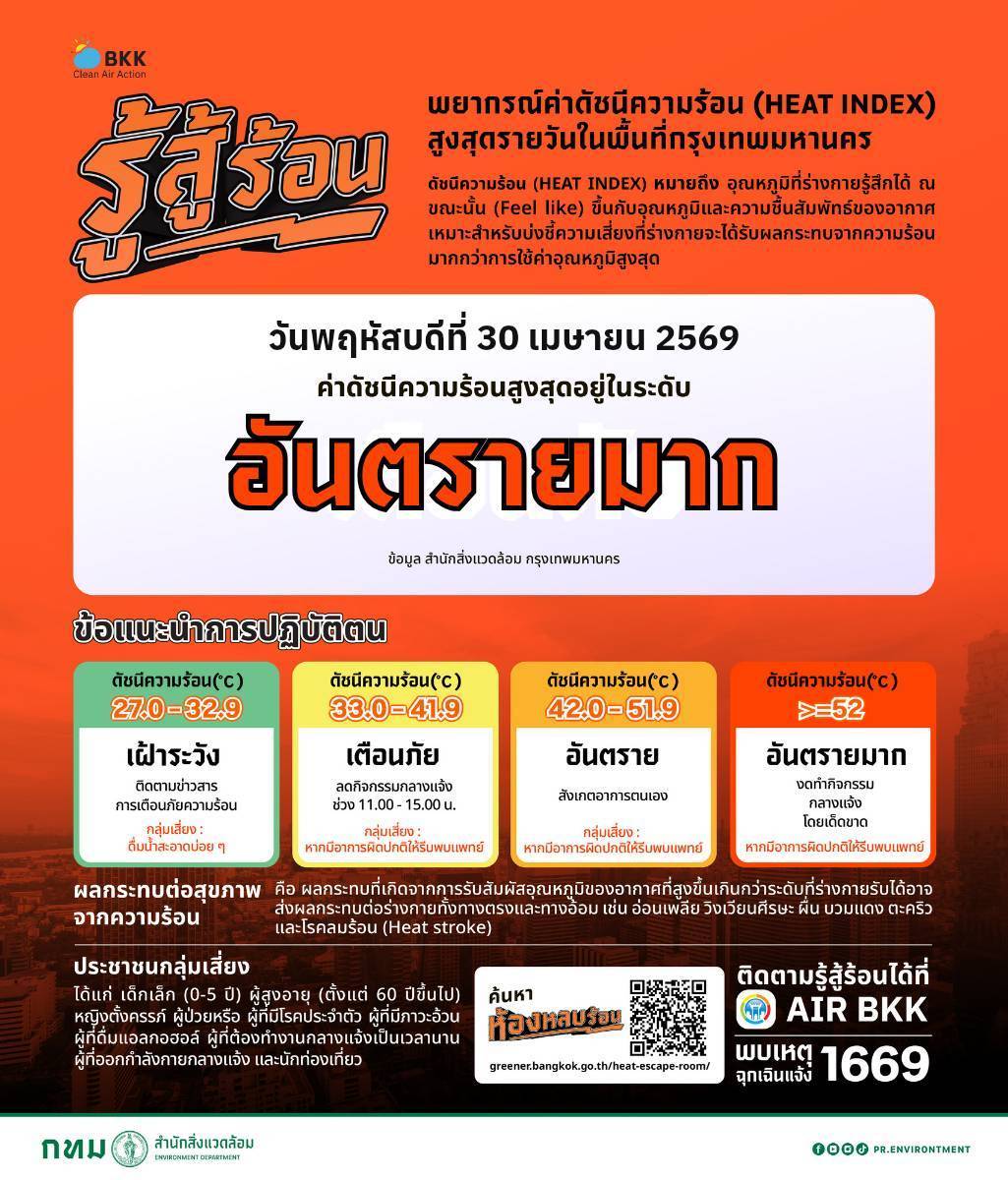 กรุงเทพฯ เตือน “ร้อนอันตรายมาก” วันนี้ (30 เม.ย. 69) ดัชนีความร้อนพุ่งสูงสุดอยู่ในระดับเสี่ยงอันตรายต่อสุขภาพ ร่างกายอาจได้รับผลกระทบจากความร้อนรุนแรง เช่น อ่อนเพลีย เป็นลมแดด หรือฮีตสโตรก